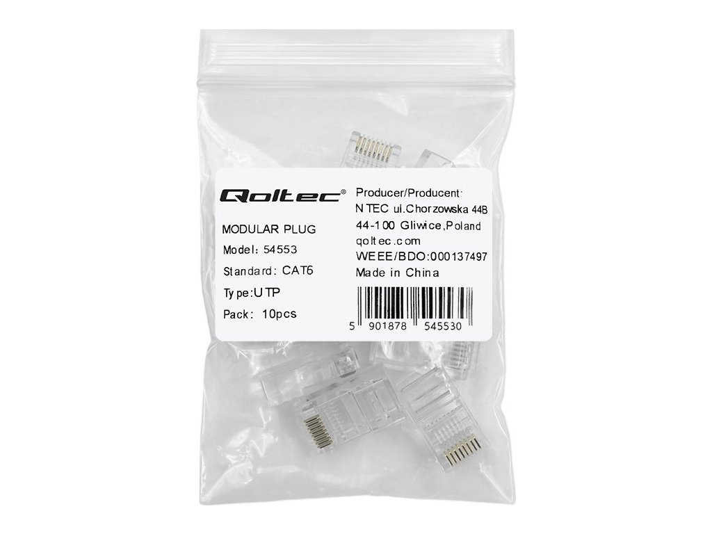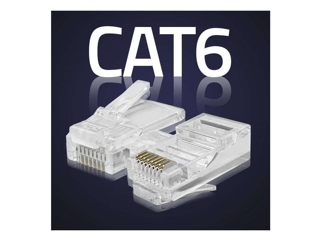 Vysoce kvalitní sada konektorů RJ45 s modulárním designem, kompatibilní s patch cord kabely UTP Cat6 . Konektor má pozlacené kovové kontakty pro lepší vodivost a ochranu proti korozi . Nemají dodatečnou ochrannou clonu. Navrženo pro použití na místech s intenzivním rušením.