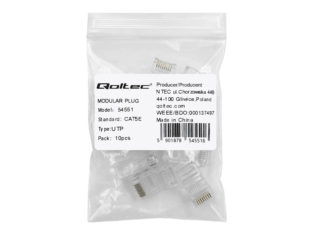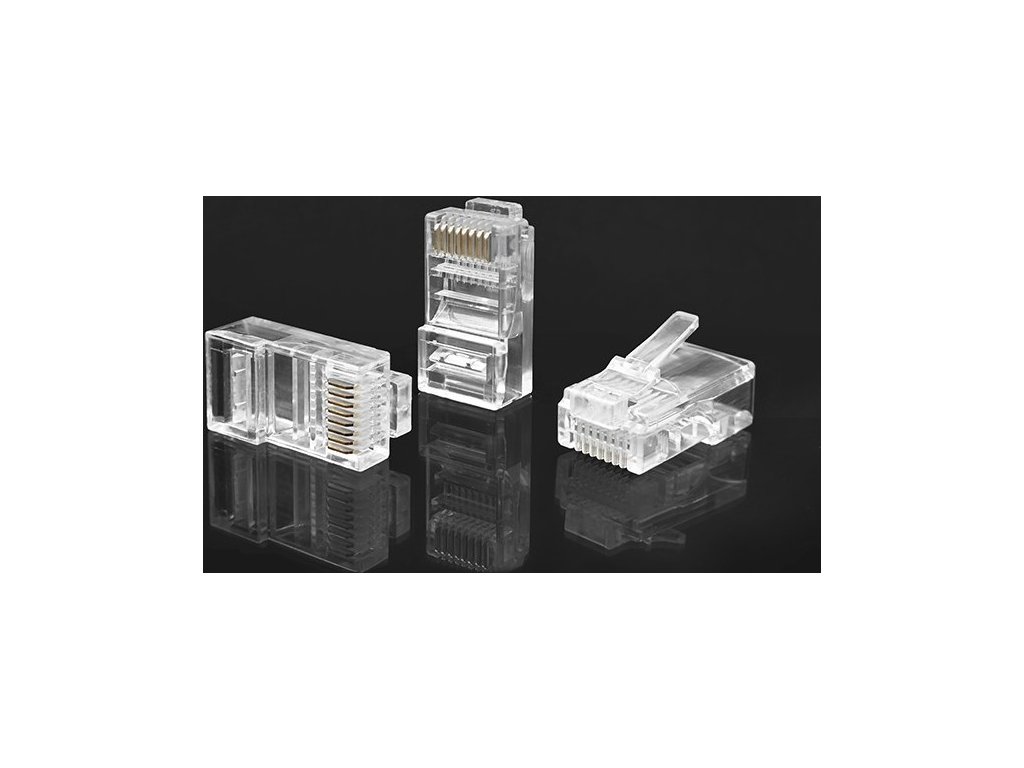 Vysoce kvalitní sada kovových konektorů RJ45 s modulárním designem, kompatibilní s patch cord kabely UTP Cat5e . Konektor má pozlacené kovové kontakty pro lepší vodivost a ochranu proti korozi . Nemají dodatečnou ochrannou clonu. Navrženo pro použití na místech s intenzivním rušením.