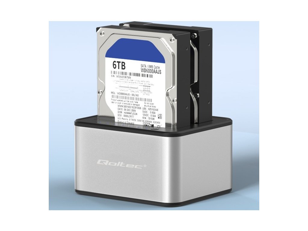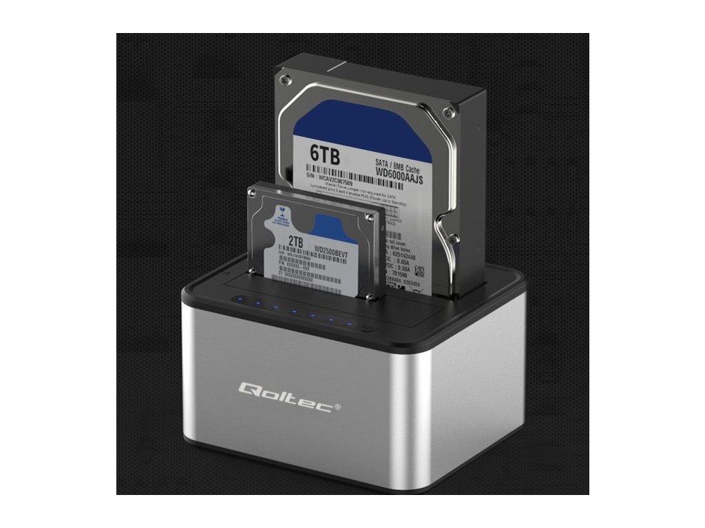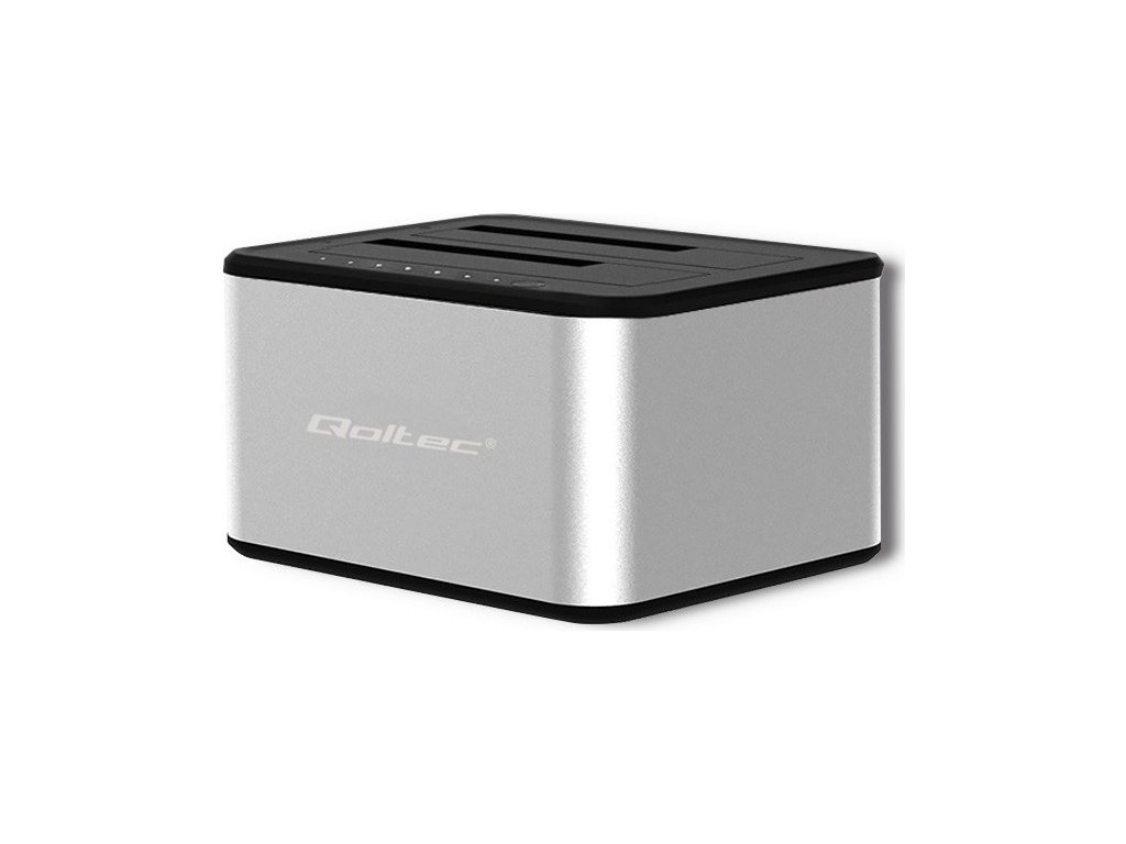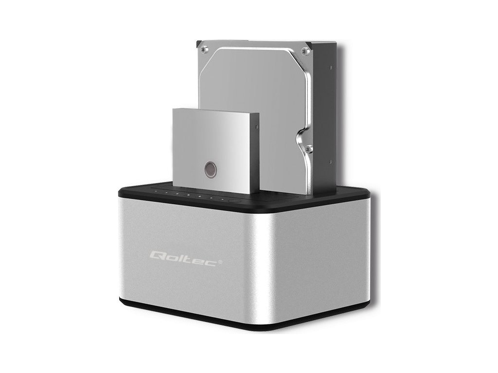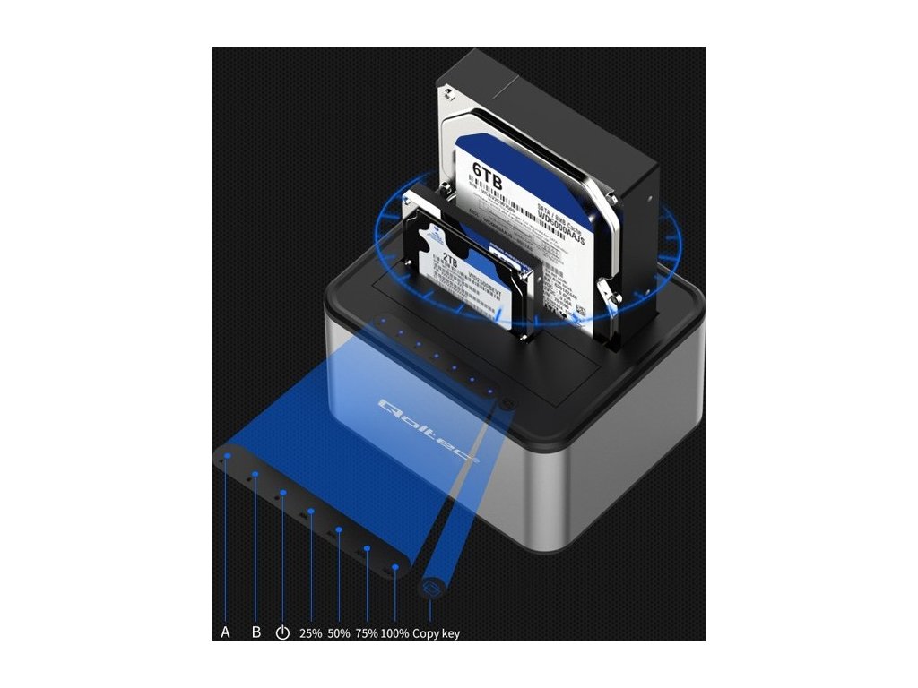 Prezentovaný model dokovací stanice Qoltec má funkci vytváření kopií dat mezi disky v režimu offline stisknutím spínače na krytu. Klonování probíhá bez připojení k počítači a průběh a dokončení procesu je indikováno rozsvícenými LED diodami.