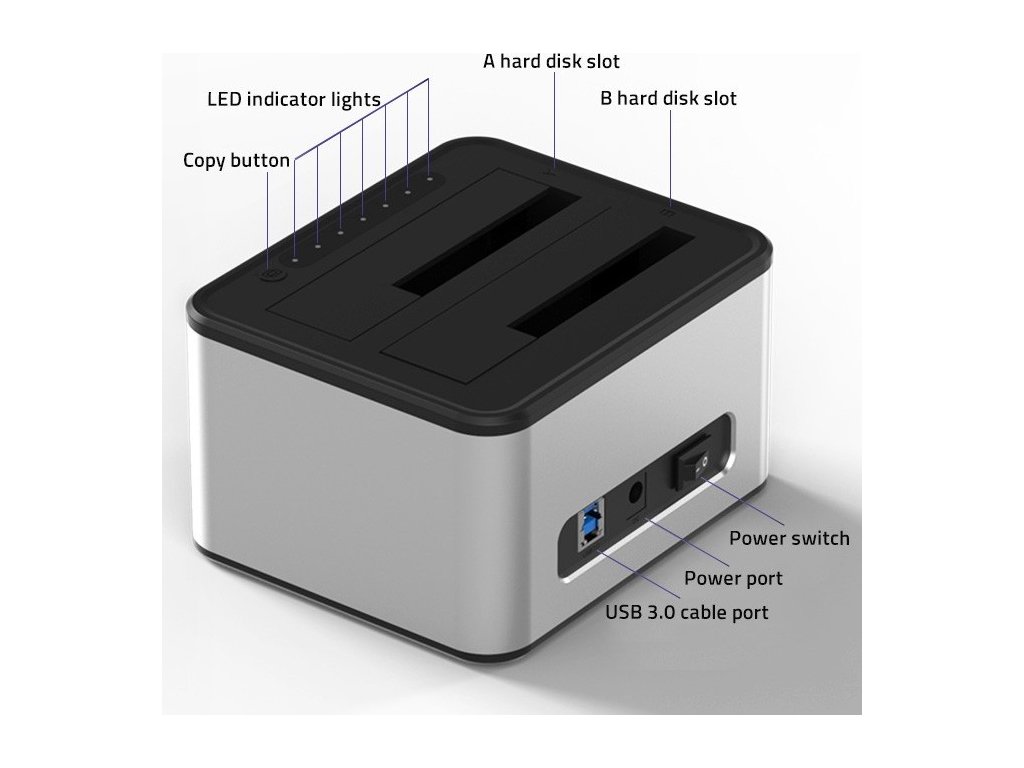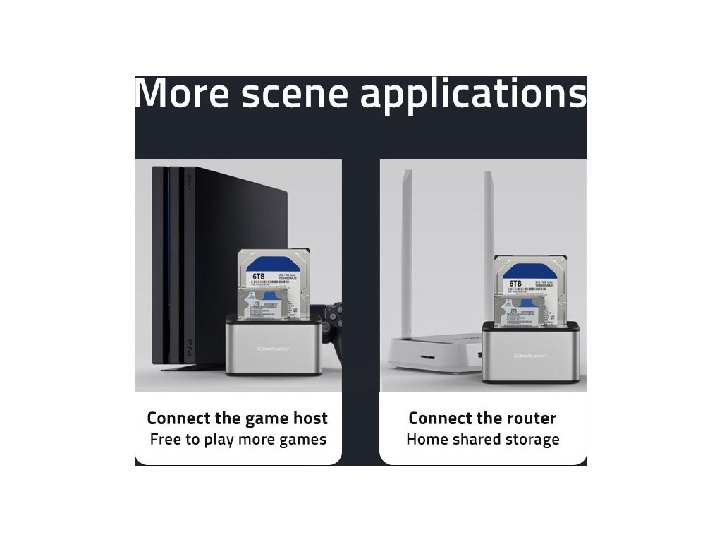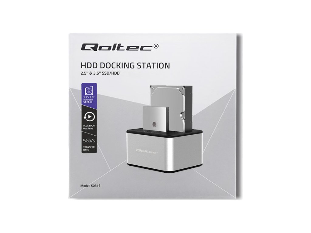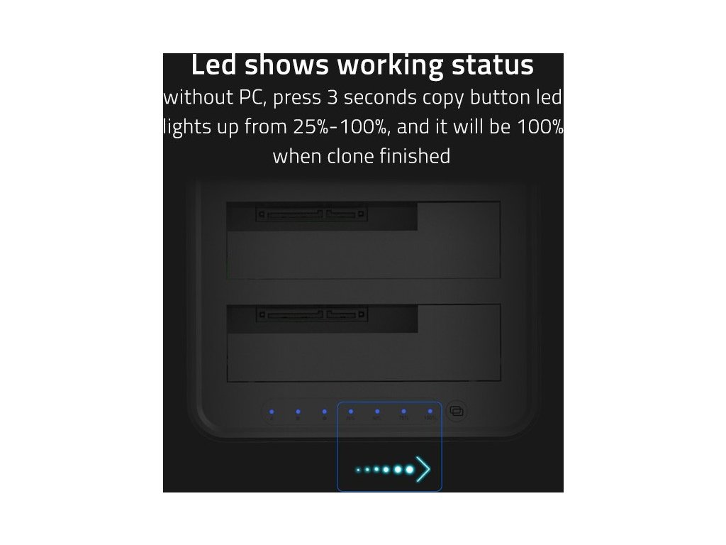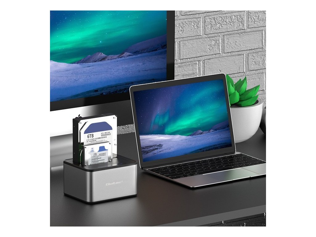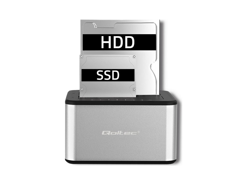 Prezentovaný model dokovací stanice Qoltec má funkci vytváření kopií dat mezi disky v režimu offline stisknutím spínače na krytu. Klonování probíhá bez připojení k počítači a průběh a dokončení procesu je indikováno rozsvícenými LED diodami.