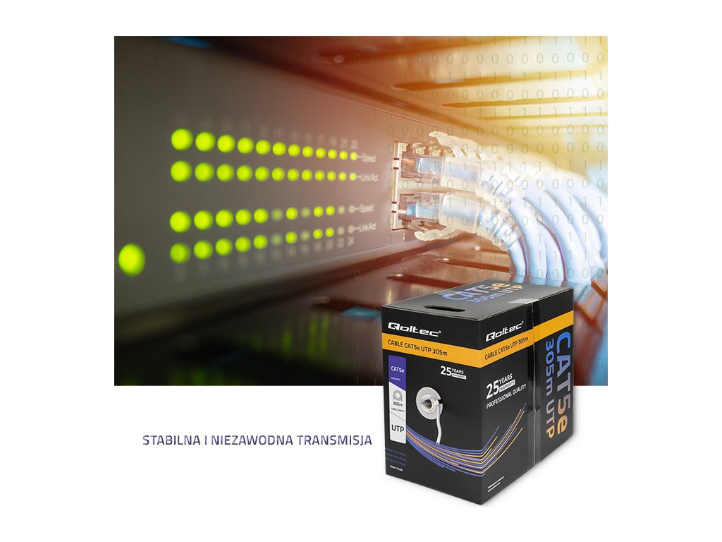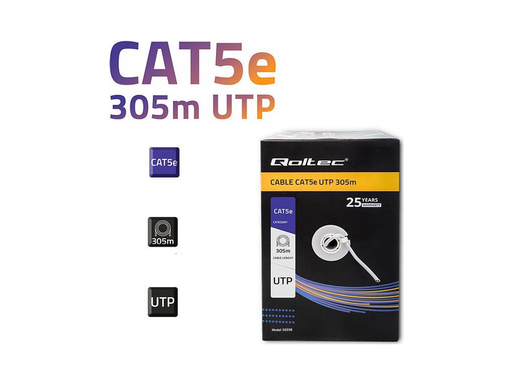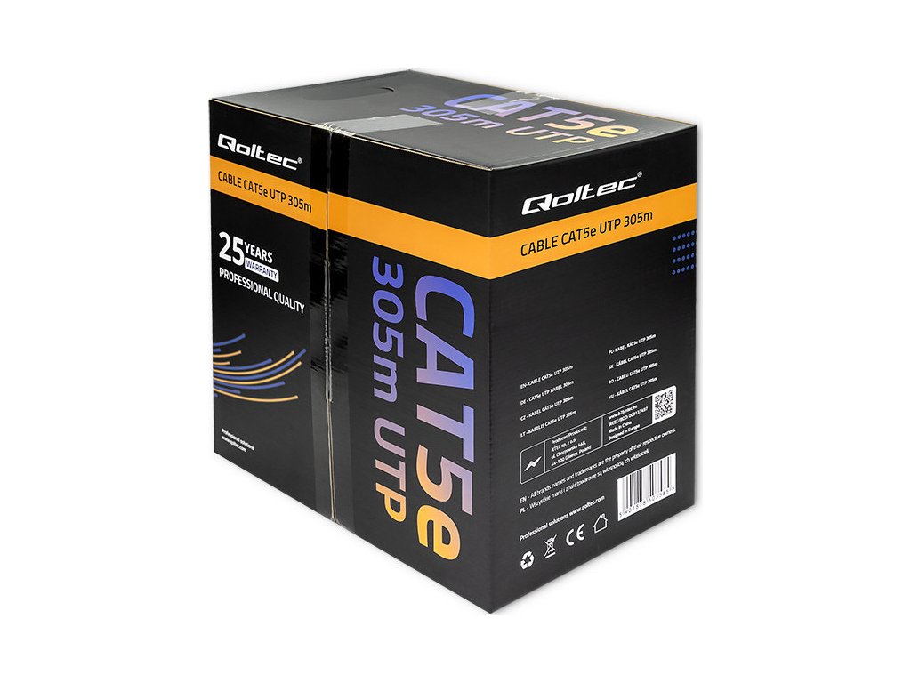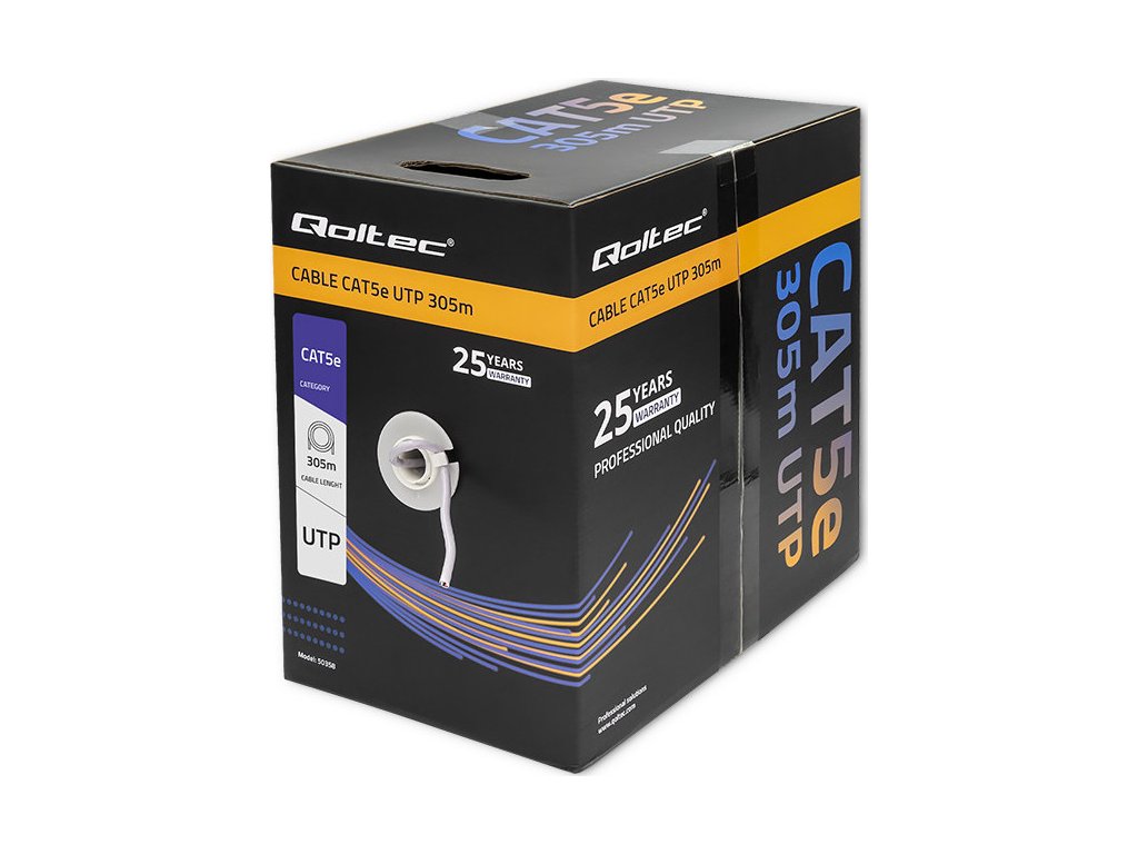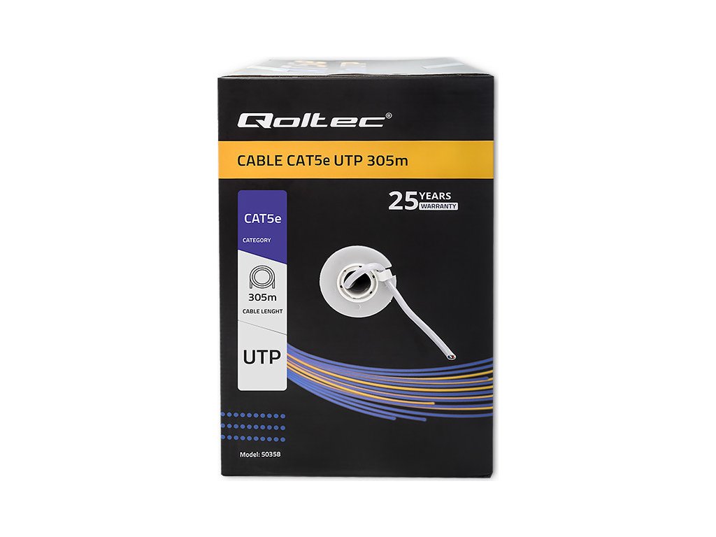UTP CAT5E kabel od Qoltec, 305 m dlouhý , kroucená dvojlinka, určený pro vnitřní instalace. Používá se zejména v ICT sítích, počítačových sítích, pro napájení, přenos dat a v monitorovacích systémech. Kabel lze použít i pro přenos digitální HD televize.