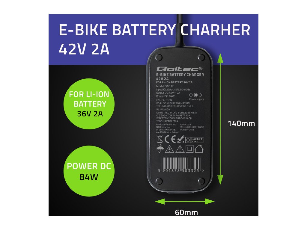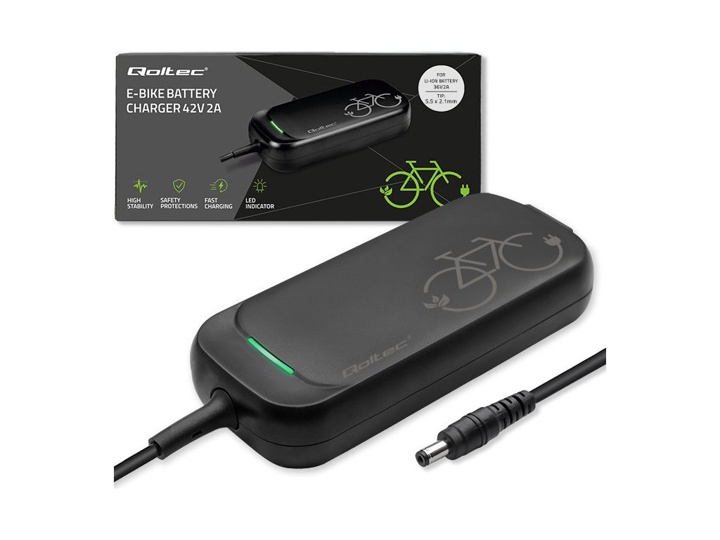 Mobilní nabíječka Qoltec s napětím 42V a intenzitou nabíjení 2A se zástrčkou 5,5*2,1 a celkovým nabíjecím výkonem 84W určená pro 36V lithium-iontové baterie , umožňuje nabíjení baterie z jakékoli 230V elektrické zásuvky . Toto pohodlné a funkční řešení s pokročilou elektronikou chrání vaši baterii během procesu nabíjení.