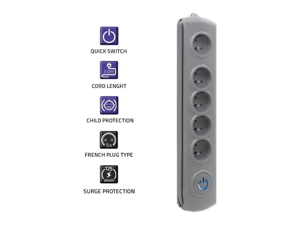 Anti-surge power strip | 5 zásuvek | 3 m | Šedá