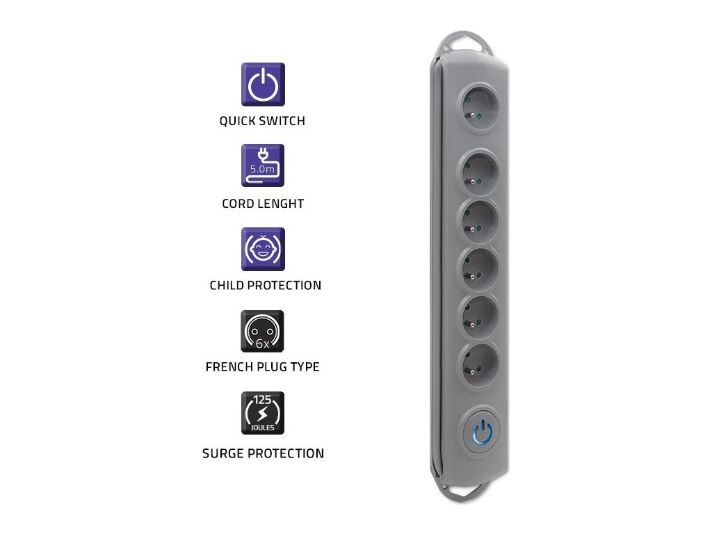 Anti-surge power strip | 6 zásuvek | 5 m | Šedá