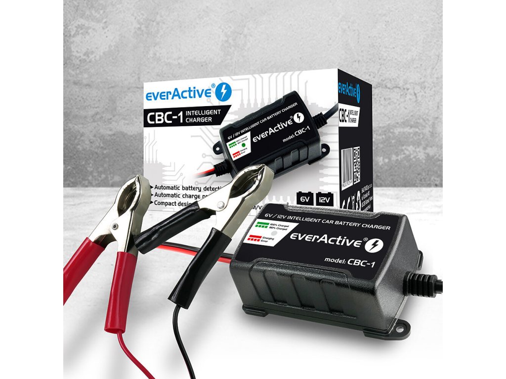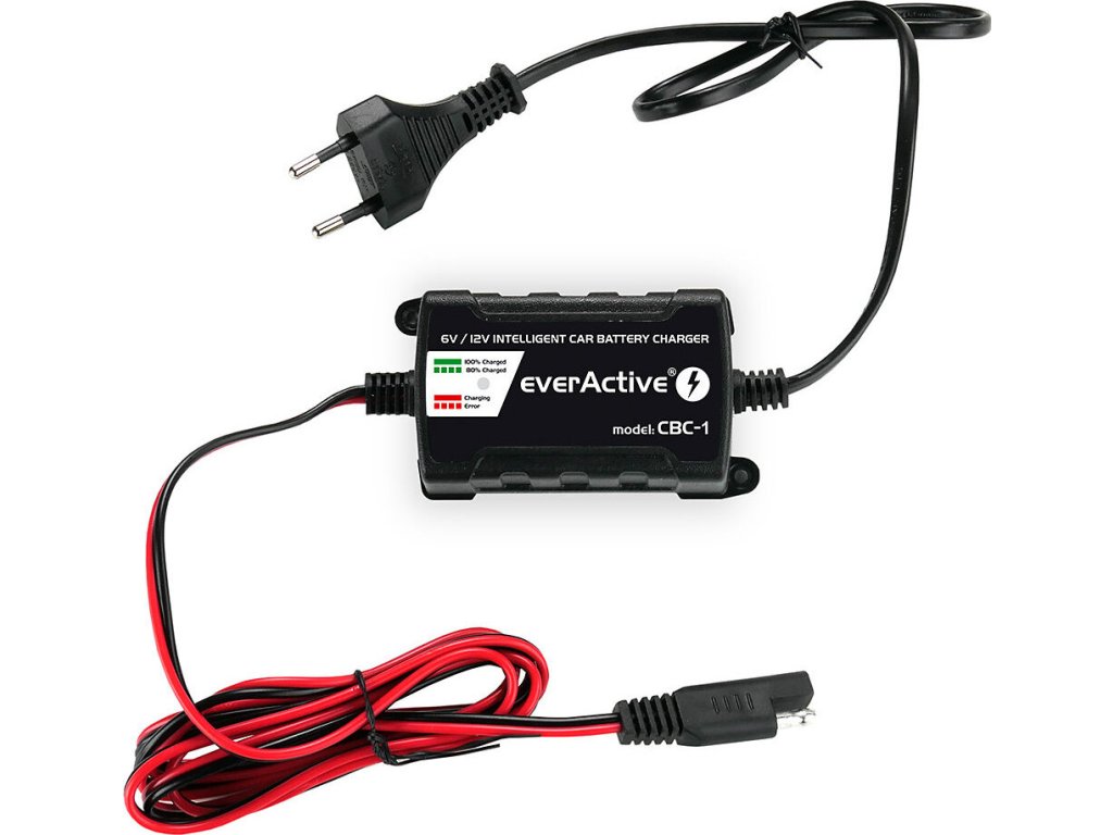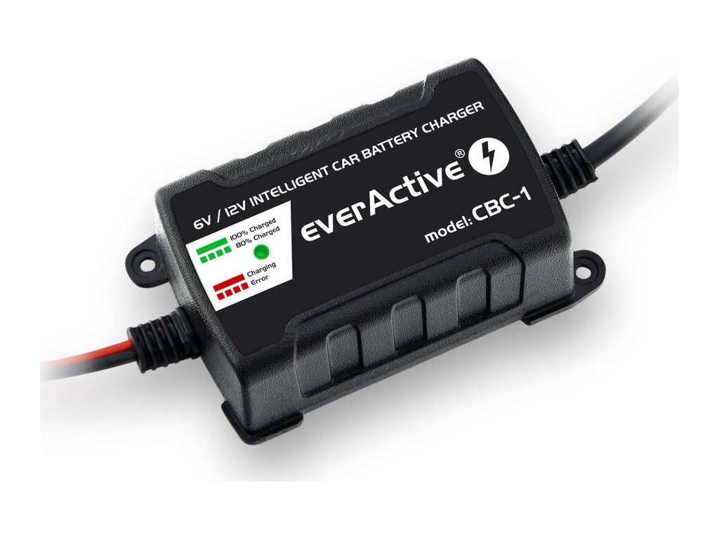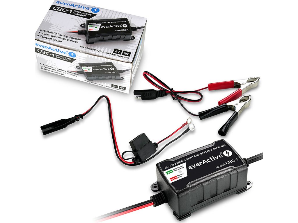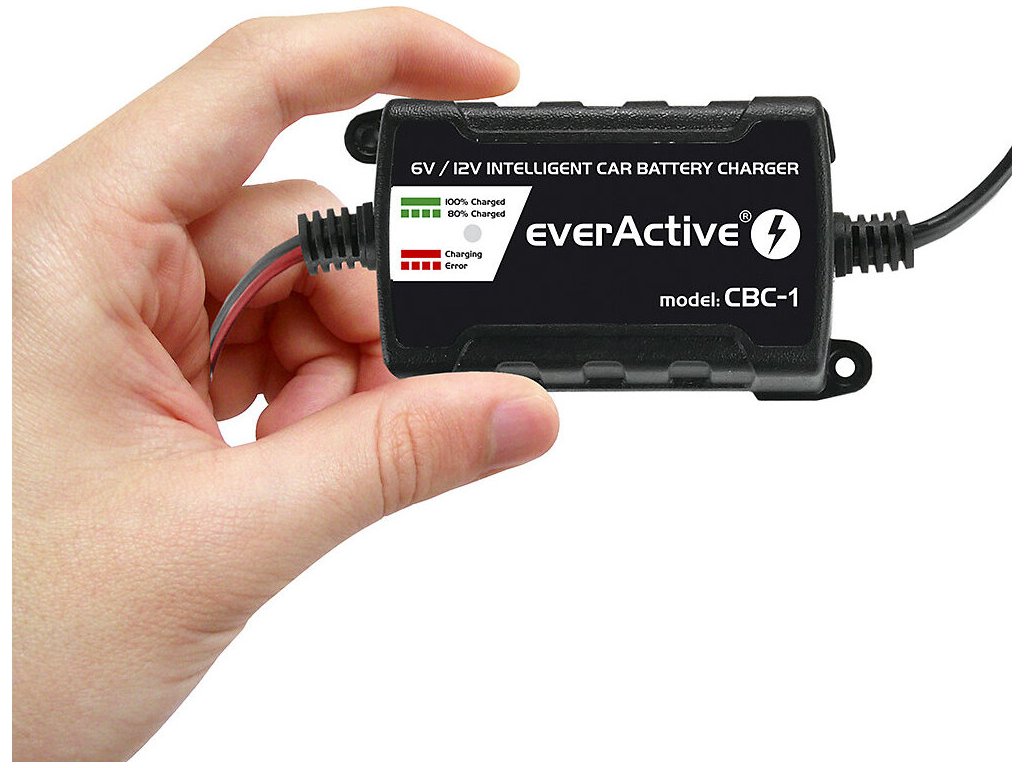 everActive CBC1 je univerzální vyrovnávací nabíječka /tzv "inteligentní usměrňovač" pro všechny typy kyselinových baterií (auto apod.) 6V a 12V, gelové / AGM.
