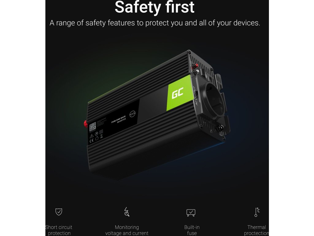 Pro zajištění maximální bezpečnosti jsou všechny invertory Green Cell vybaveny vyměnitelnými pojistkami , které poskytují ochranu měniče a připojených zařízení. Výměna pojistky je velmi jednoduchá a neměla by způsobit žádné problémy. Ke každému měniči jsou zahrnuty náhradní pojistky , aby se zajistila bezpečnost při používání a co nejdelší životnost zařízení.