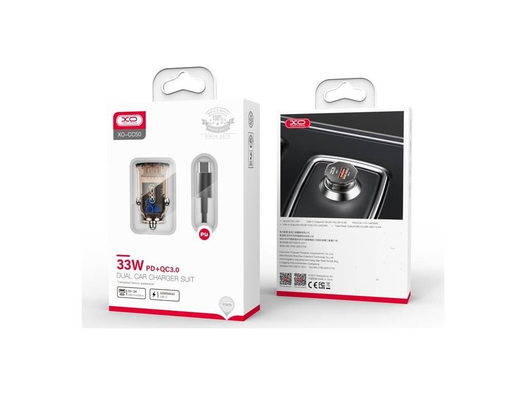 XO Clear Speciální řada příslušenství s průhlednými prvky, aby uživatel mohl obdivovat vnitřek produktu XO CC50 je autonabíječka se dvěma USB + USB-C porty Díky malým rozměrům nabíječky zařízení zabírá málo místa. v autě.