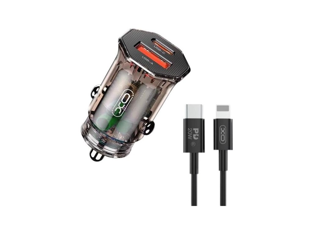 Autonabíječka pro telefony s USB a USB-C zásuvkou PD XO CC50 30W + USB-C - Lightning kabel 1m