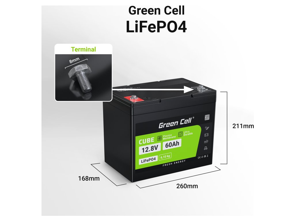 LiFePO4 baterie od Green Cell vám umožňují sestavit sady až 4 kusů (25.6V/38.4V/51.2V), což je ideální pro fotovoltaické instalace, skladování energie, přívěsné motory nebo elektrická vozidla.