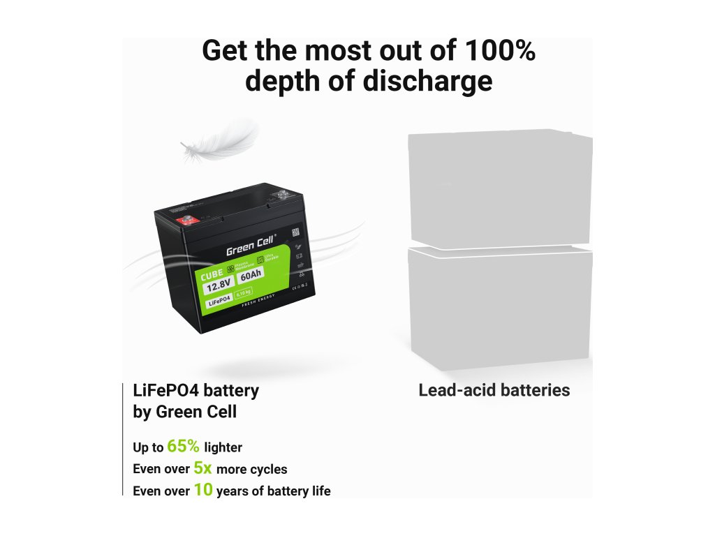 Vysoký výkon LiFePO4 baterie umožňuje udržet napětí i při jejím maximálním vybití . Lithium-železofosfátové baterie jsou navíc až třikrát lehčí než jiné typy baterií.