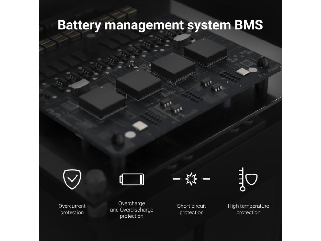 Baterie jsou vybaveny prvotřídním BMS (Battery Management System). Úkolem tohoto systému je sledovat napětí a teplotu článků během nabíjení i vybíjení. Při překročení nebezpečných hodnot systém přeruší napájení, čímž zajistí bezpečnost baterie, připojených zařízení a především uživatele!