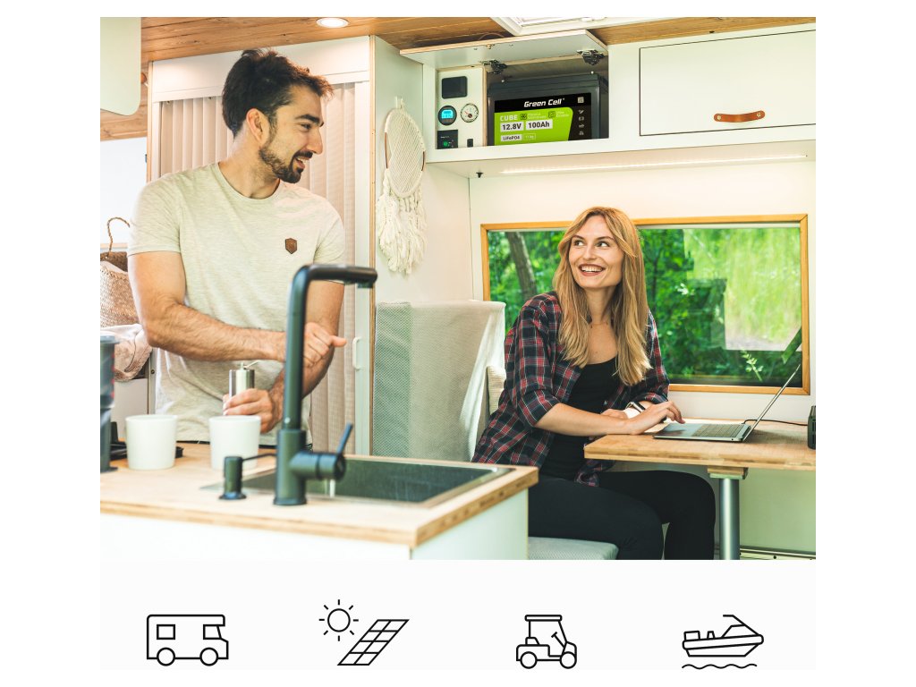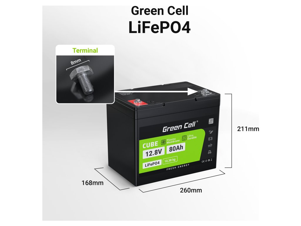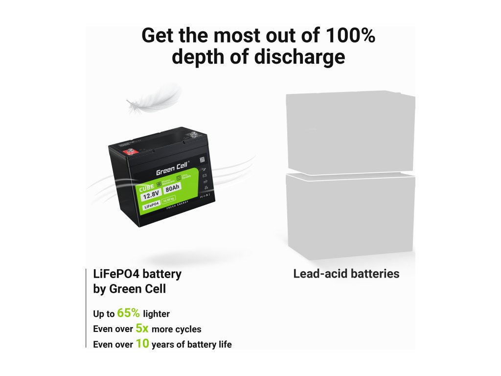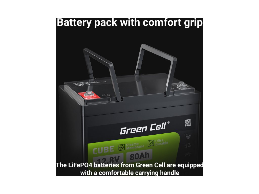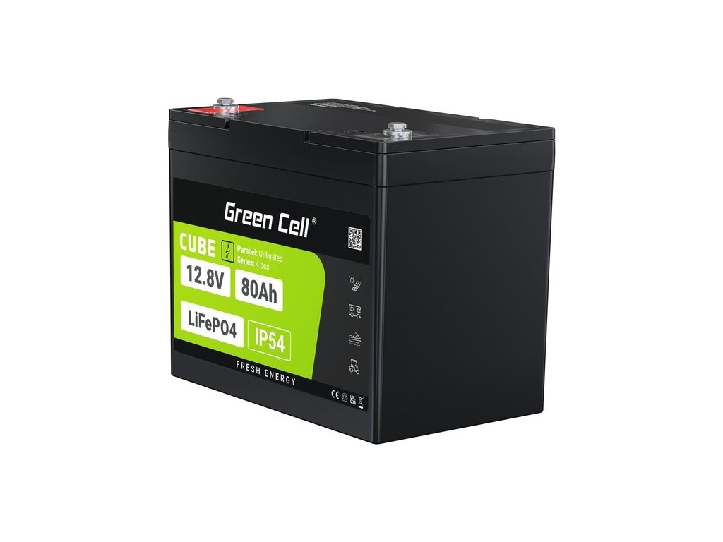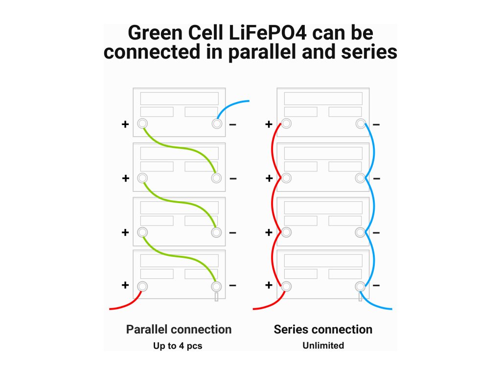 LiFePO4 baterie od Green Cell vám umožňují sestavit sady až 4 kusů (25.6V/38.4V/51.2V), což je ideální pro fotovoltaické instalace, skladování energie, přívěsné motory nebo elektrická vozidla.
