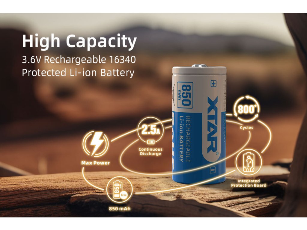 Baterie XTAR 850mAh 16340 je kvalitní lithium-iontový akumulátor navržený pro spolehlivé a stabilní napájení různých zařízení, jako jsou svítidla. S kapacitou 850mAh a napětím 3,6V poskytuje delší dobu provozu a je ideální pro zařízení s vysokými energetickými nároky. Tento akumulátor je plně nabíjetelný a má více než 800 nabíjecích cyklů, což z něj činí dlouhodobou a nákladově efektivní volbu. Obsahuje také ochranné obvody proti přebití, vybíjení pod minimálním napětím a zkratem, čímž se zajišťuje bezpečné používání.