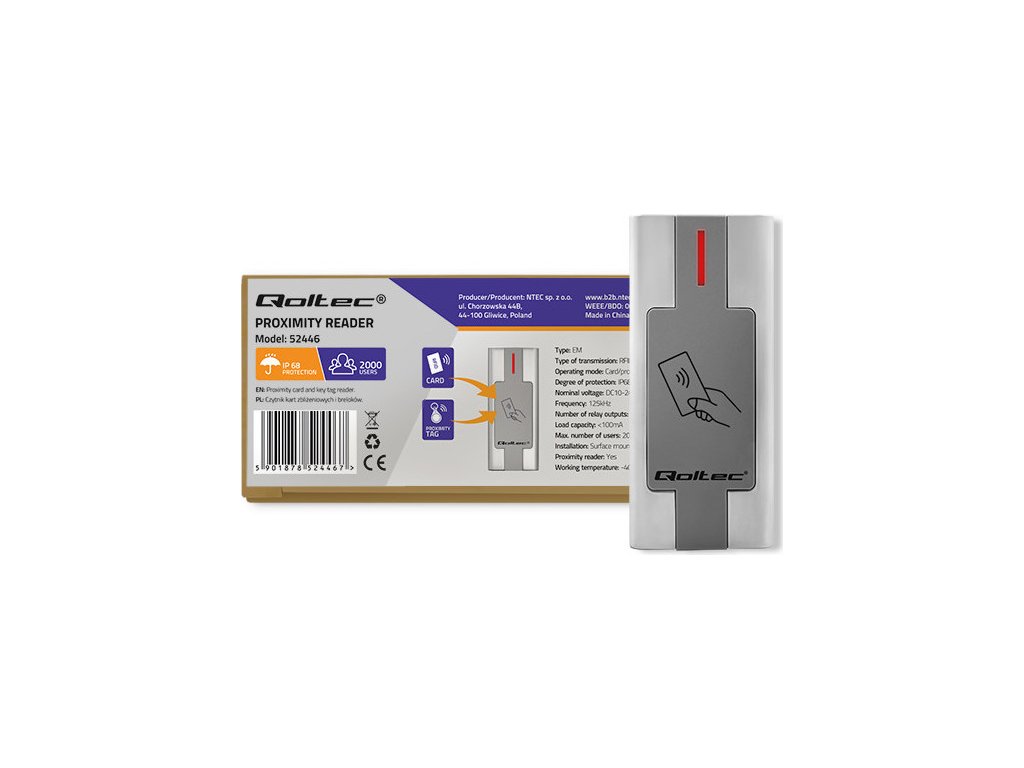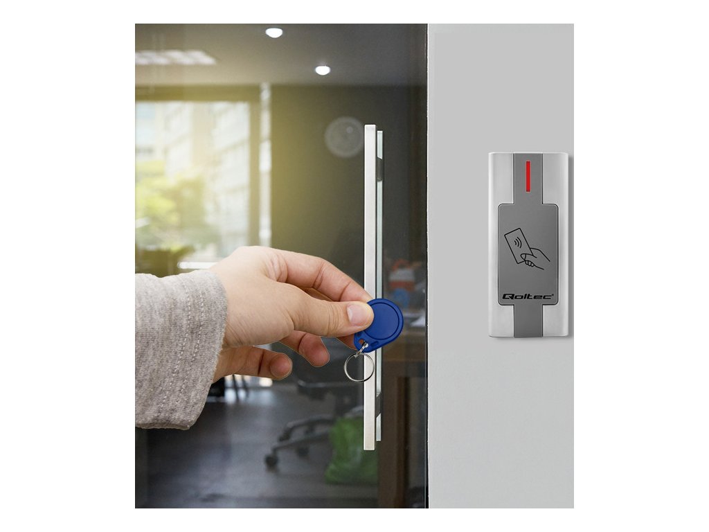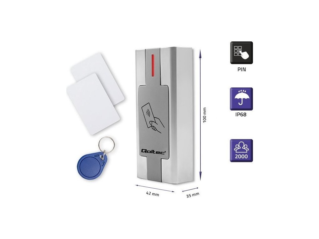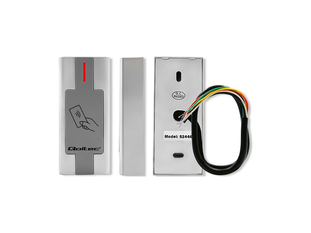 Bezdotyková čtečka Qoltec umožňuje naprogramovat až 2 000 uživatelů . Zařízení má zabudovanou LED a zvukový signál . Po načtení karty je správný chod signalizován zelenou LED a jedním zvukovým signálem. Po 10 neúspěšných pokusech o přístup během jedné minuty se aktivuje zámek a čtečka se automaticky zablokuje na dobu 10 minut.