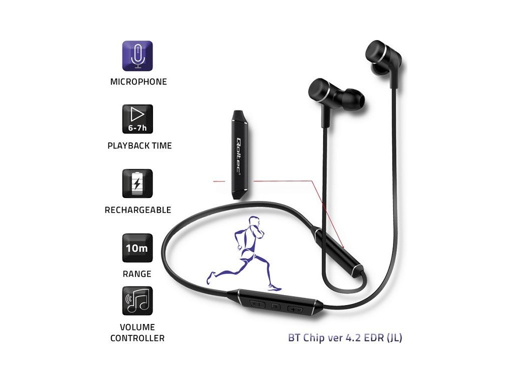 Bezdrátová sluchátka Qoltec jsou ideální pro lidi, kteří si cení pohodlí při fyzické aktivitě a moderní design. Technologie Bluetooth 4.2 umožňuje bezdrátové používání sluchátek a dosah až 10 metrů zajišťuje volnost pohybu. Magnetické hroty sluchátek umožňují jejich vzájemné propojení, takže vám nesklouznou z krku, neztratíte je a ani se vám nezamotá kabel. Univerzální dálkové ovládání umožňuje ovládat hudbu, nastavovat hlasitost a přijímat/odmítat příchozí hovory. Vše řídí kontrolní dioda. Plné nabití vám umožní vychutnávat si hudbu až 7 hodin. V balení se kromě sluchátek nachází také USB/Micro USB kabel, dva páry přídavných sluchátek a návod k použití.