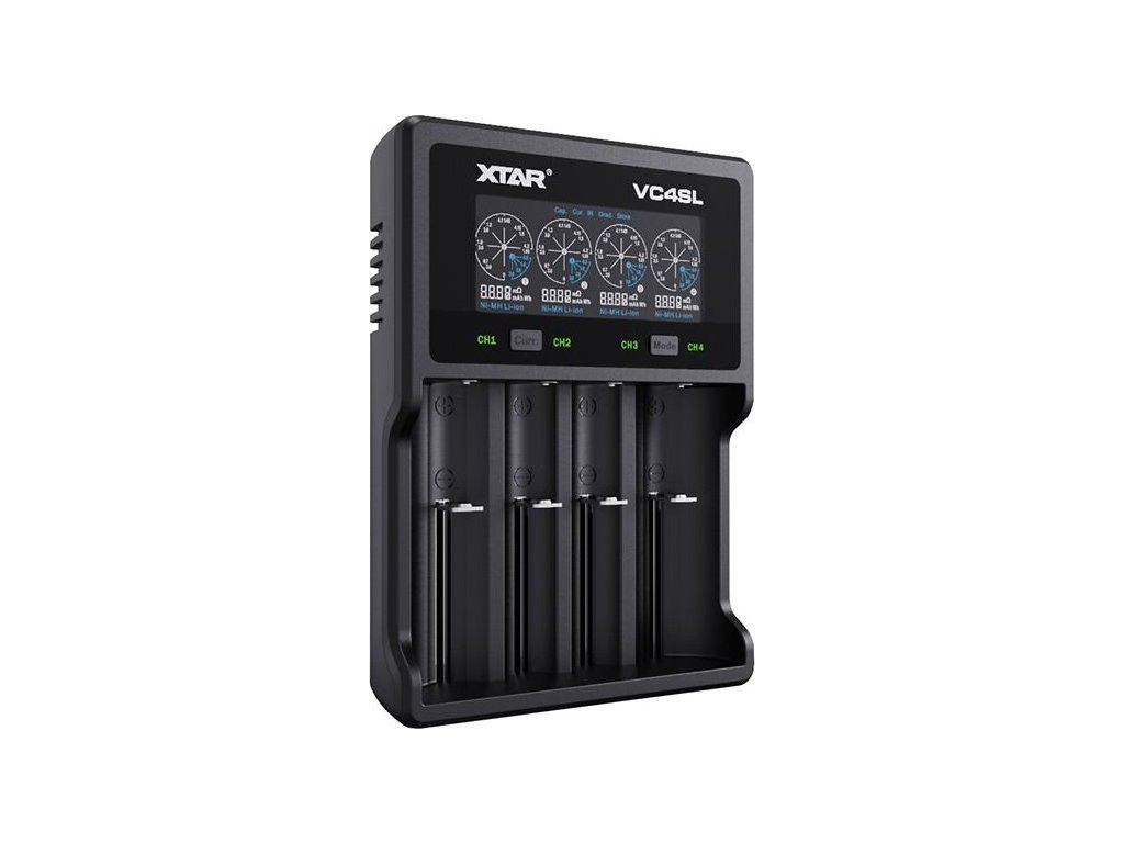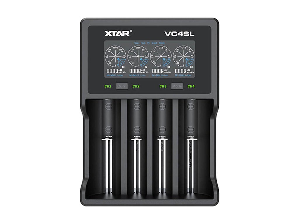 Podsvícený VA LCD displej nabíječky Xtar VC4SL zobrazuje aktuální informace o provozním stavu nabíječky: nabití baterie vyjádřené v mAh, napětí baterie, nabíjecí proud a vnitřní odpor článku. Kromě funkce nabíjení má nabíječka VC4SL i 2 další režimy: