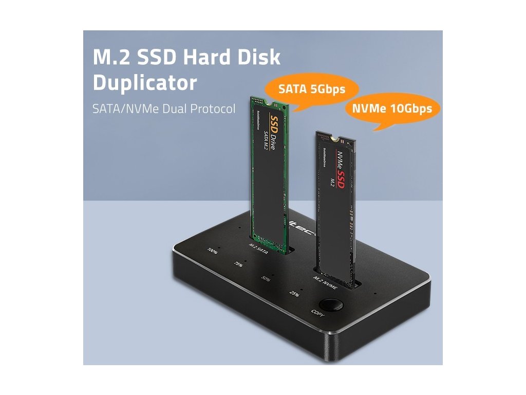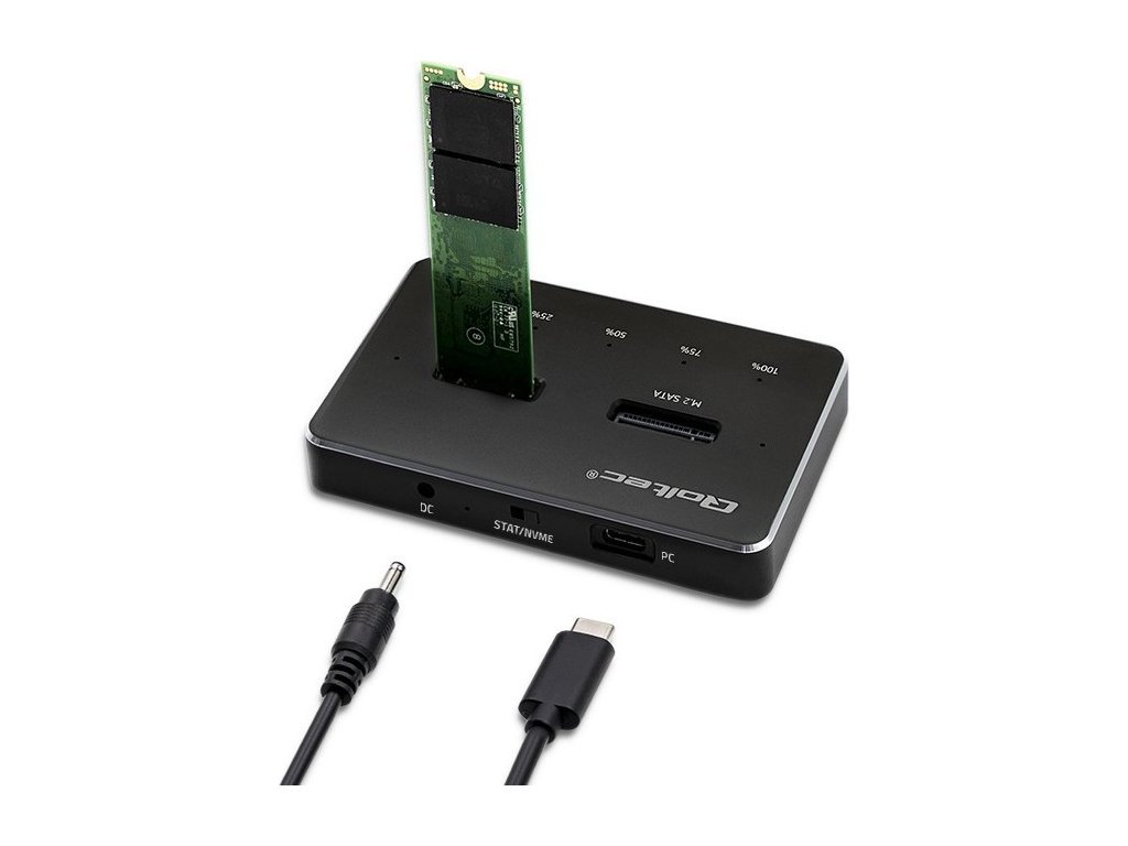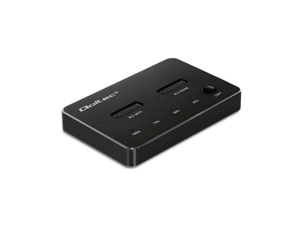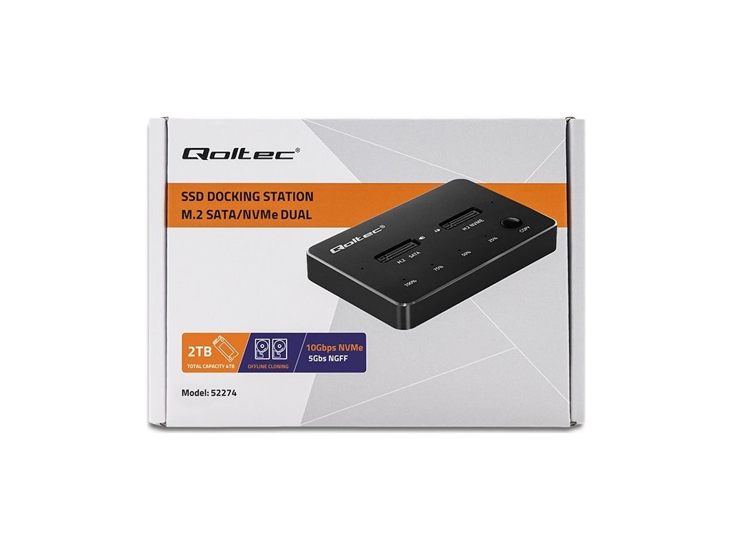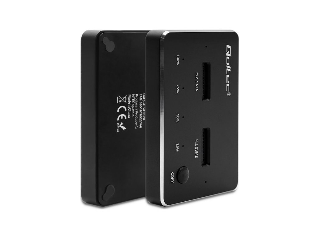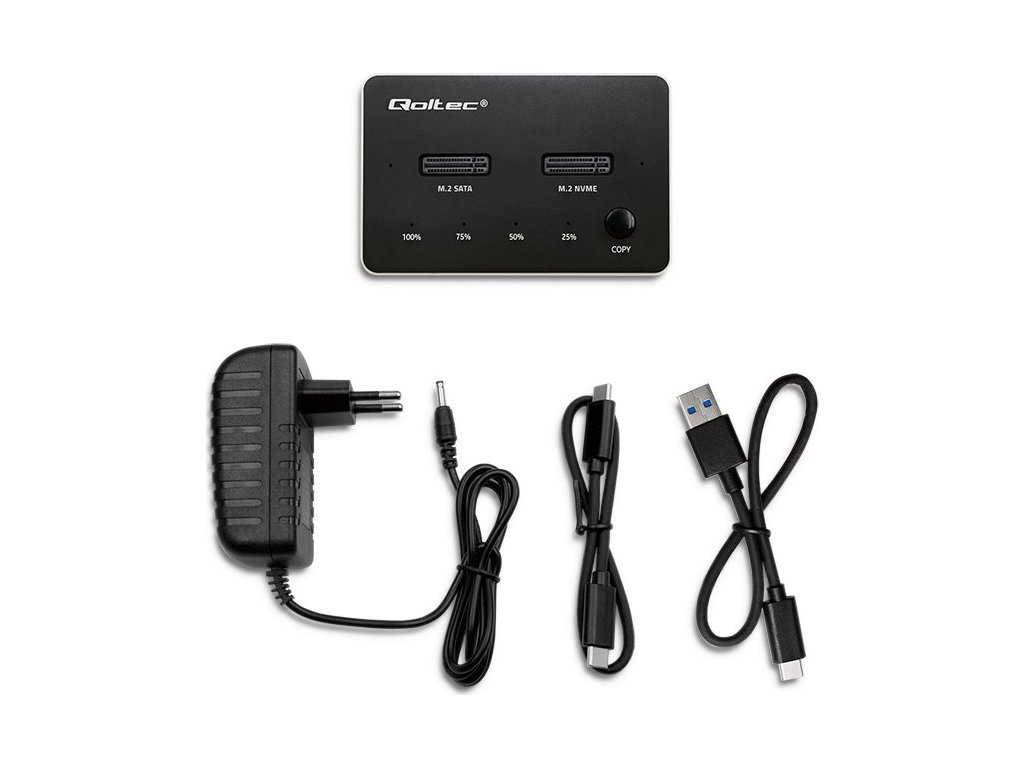 Stanice je kompatibilní s M.2 disky s rozhraním SATA a NVMe. Nabízí rychlost přenosu dat až 10 Gb/s . Disková jednotka Qoltec je navíc zařízení: