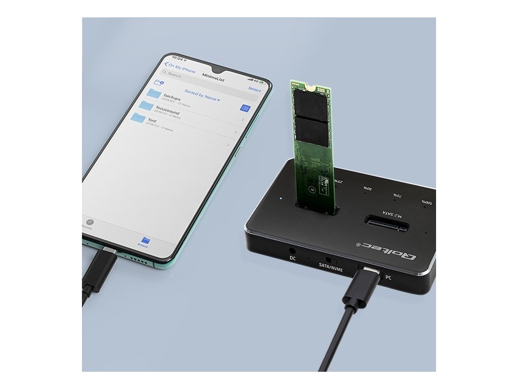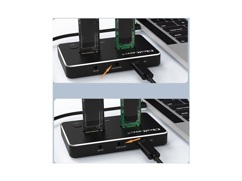 Instalace SSD je jednoduchá, rychlá a nevyžaduje žádné speciální technické dovednosti . Jediné, co musíte udělat, je vložit NVMe nebo SATA SSD do dokovací stanice, vyjmout příslušný disk na dokovací stanici a připojit jej k příslušnému zařízení.