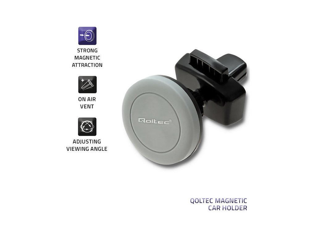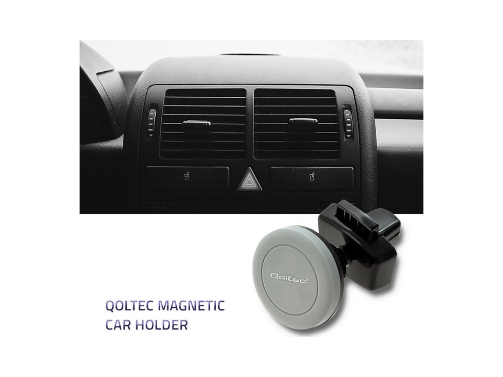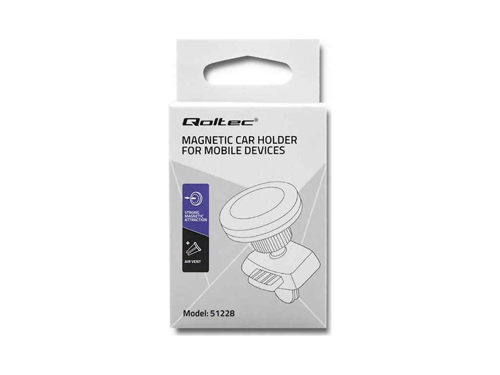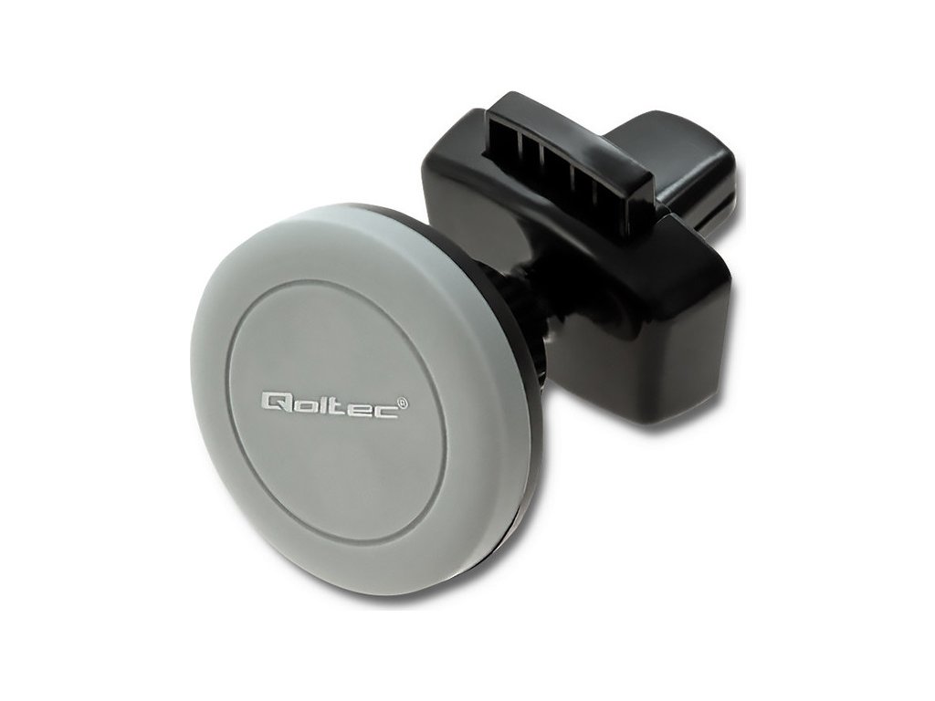 Magnetický držák do auta Qoltec se vyznačuje nejlepší kvalitou a vyroben z kvalitních materiálů. Spojuje v sobě modernu, stylový design a především funkčnost. Držák je vybaven hrotem pro montáž na mřížku ventilace auta, což zaručuje stabilní držení telefonu a tím neomezuje viditelnost při jízdě. Použitý byl speciální silný neodymový magnet, který zajišťuje stabilitu a bezpečnost telefonu během jízdy, a tak nepřekáží při provozu telefonu. Abyste mohli držák použít, jednu z kovových desek, které jsou součástí balení, přilepte na pouzdro nebo pouzdro telefonu. Rukojeť má 360stupňové nastavení, což vám dává možnost libovolně nastavit úhel sklonu tak, aby vyhovoval vašim potřebám. Dá se použít pro většinu zařízení v současnosti dostupných na trhu, tj. telefon, tablet, navigace.