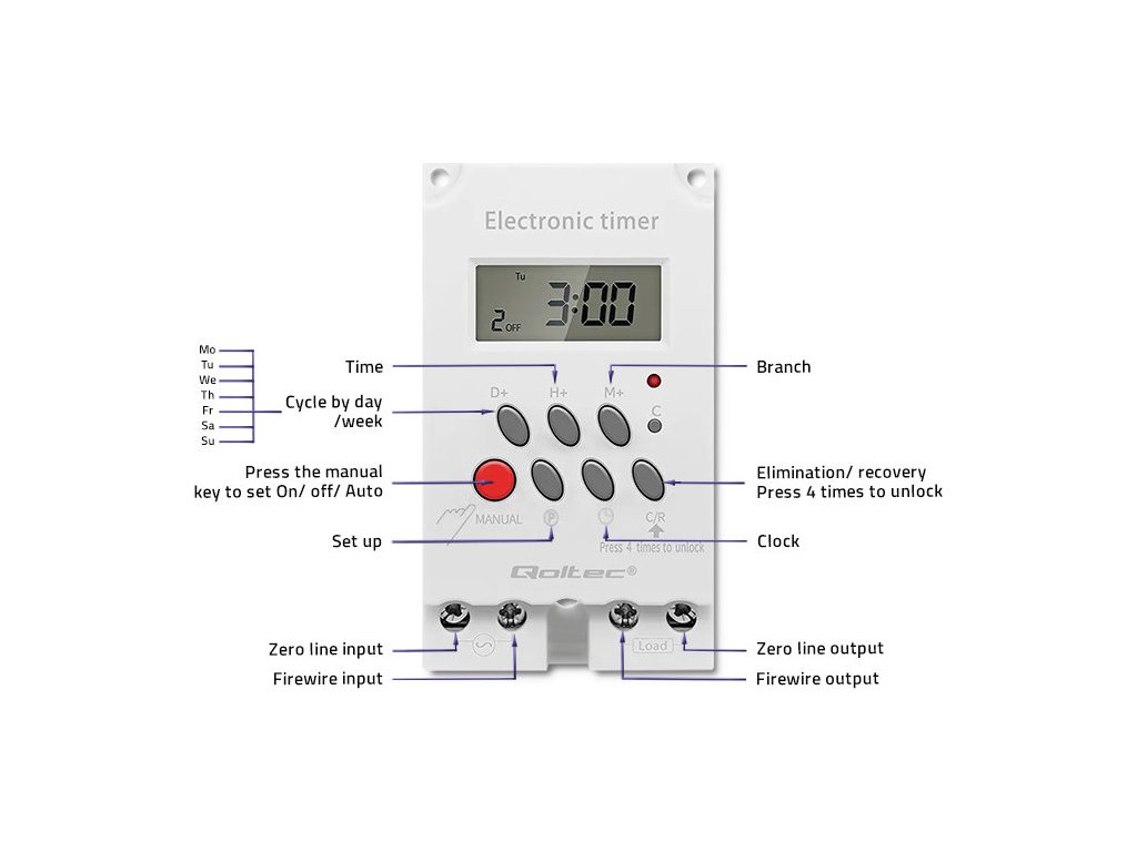 Jednoduché přepínání mezi 6 denními nebo týdenními časy , - Nastavení času zahrnuje HODINU, MINUTU a DEN, - Funkce manuálního přepínání pro nastavení časovače pro trvalé zapnutí nebo vypnutí, zapínání a vypínání v náhodných časech. během svátků.