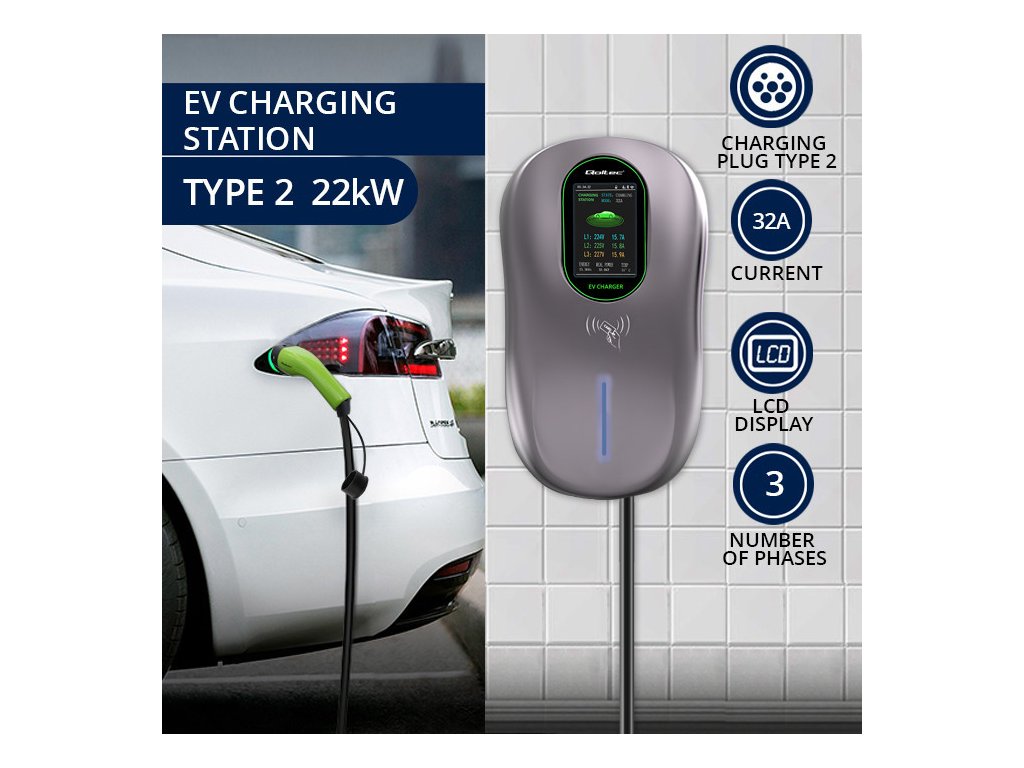 EV 2v1 Nabíjecí stanice Type2 | 22 kW | Wi-Fi | TUYA | LCD | RFID | 3 fáze | Wallbox | 5 m
