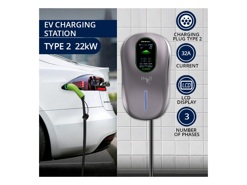 EV 2v1 Typ2 Nabíjecí stanice pro elektromobily | 22kW | LCD | 2 karty pro elektromobily | 3 fáze | Wallbox | Hotelový systém | 5m