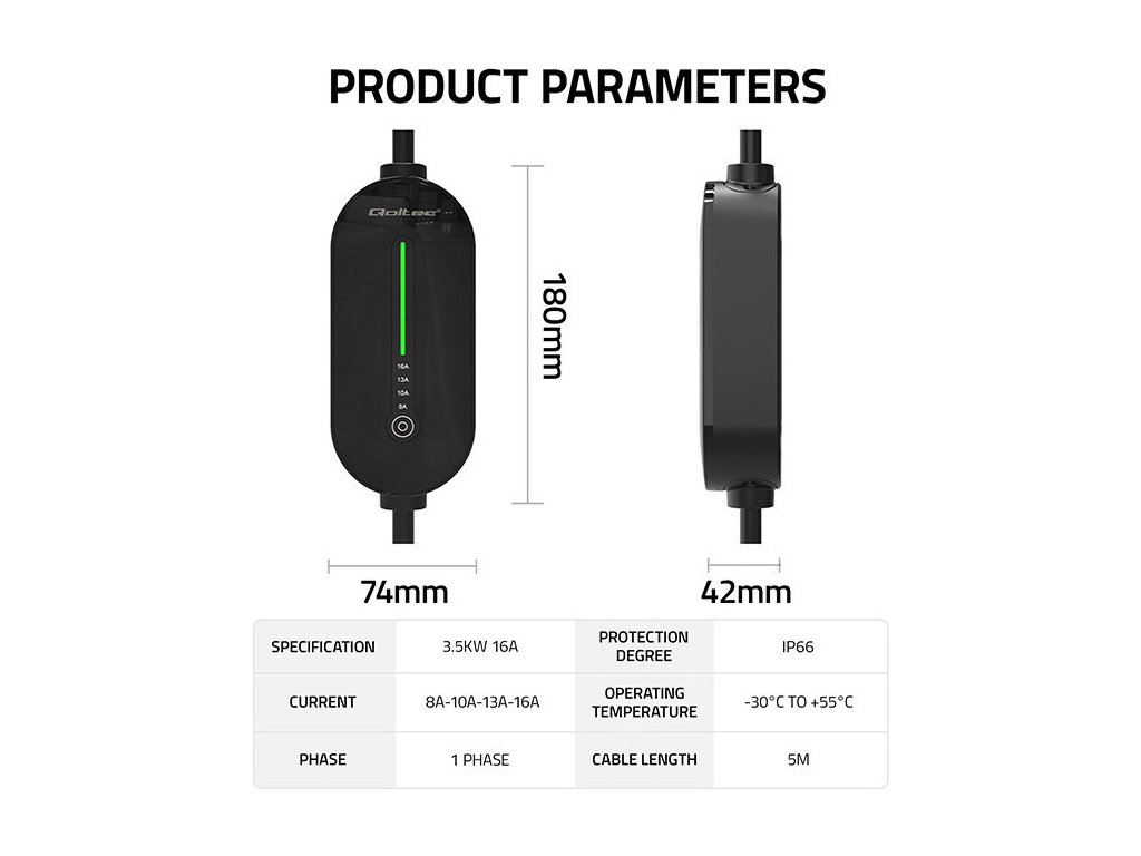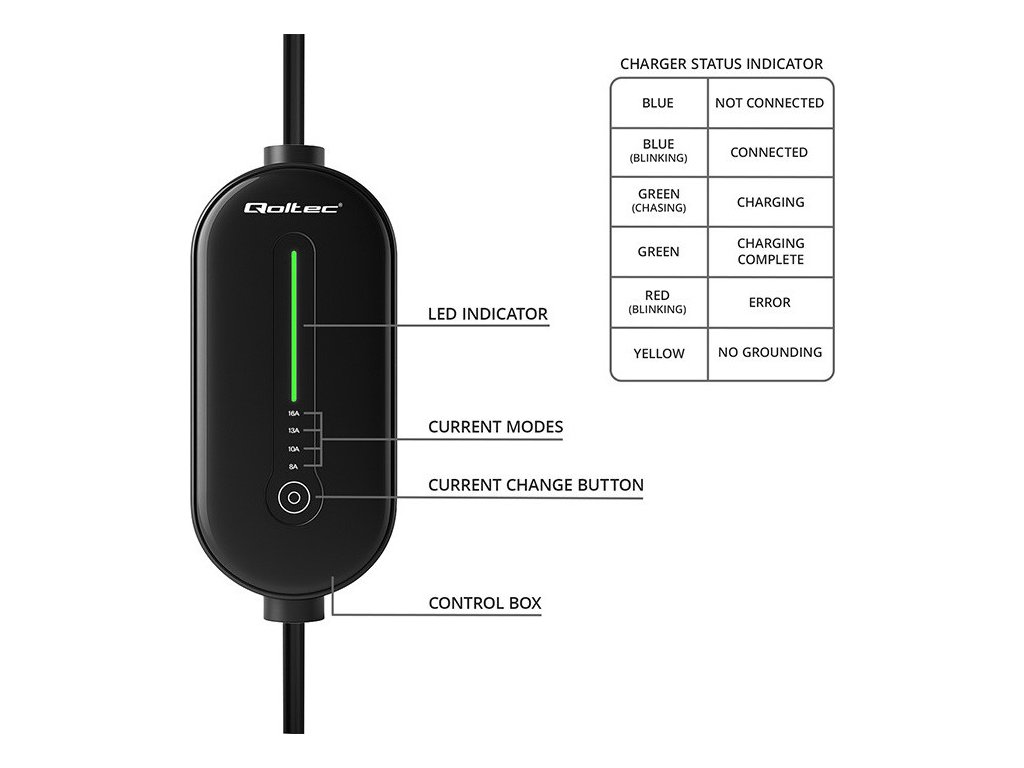 Nabíječka Qoltec podporuje čtyři proudové režimy: 8 A, 10 A, 13 A a 16 A. Stojí za zmínku, že konektor typu 2 je určen pro elektrická vozidla s nabíjecím výkonem vyšším než 3 kW .