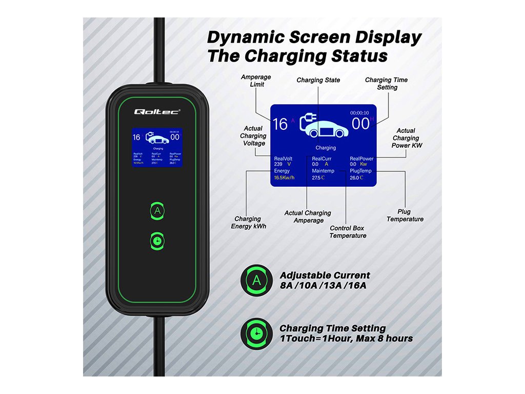 Nabíječka má konektor typu 2 , který je v současnosti oficiální normou Evropské unie a nabíjí elektromobily vybavené příslušnou nabíjecí zásuvkou. většinou elektromobilů prodávaných v Evropě. Nabíječka Qoltec podporuje čtyři proudové režimy: 8A, 10A, 13A a 16A . Je vhodné dodat, že konektor typu 2 je určen pro elektromobily s nabíjecím výkonem vyšším než 3kW .
