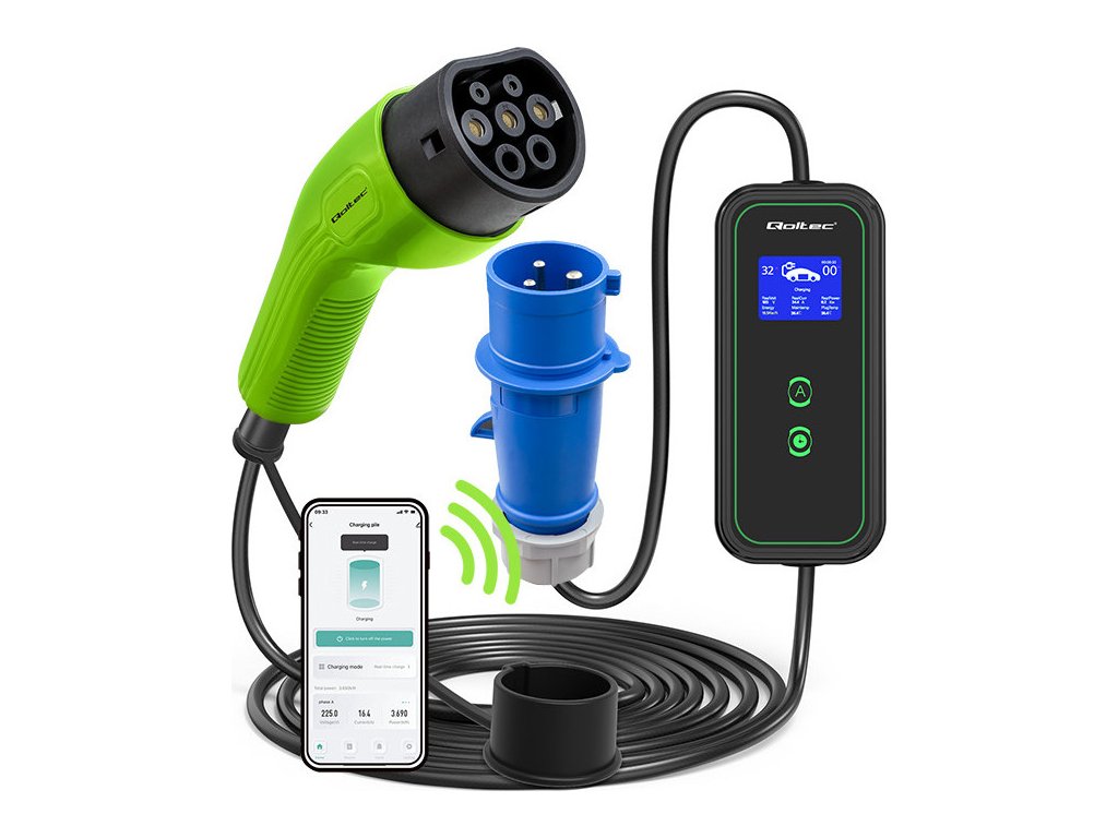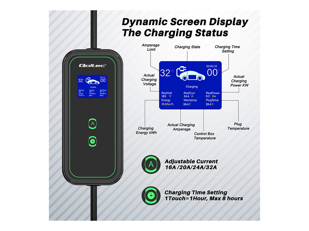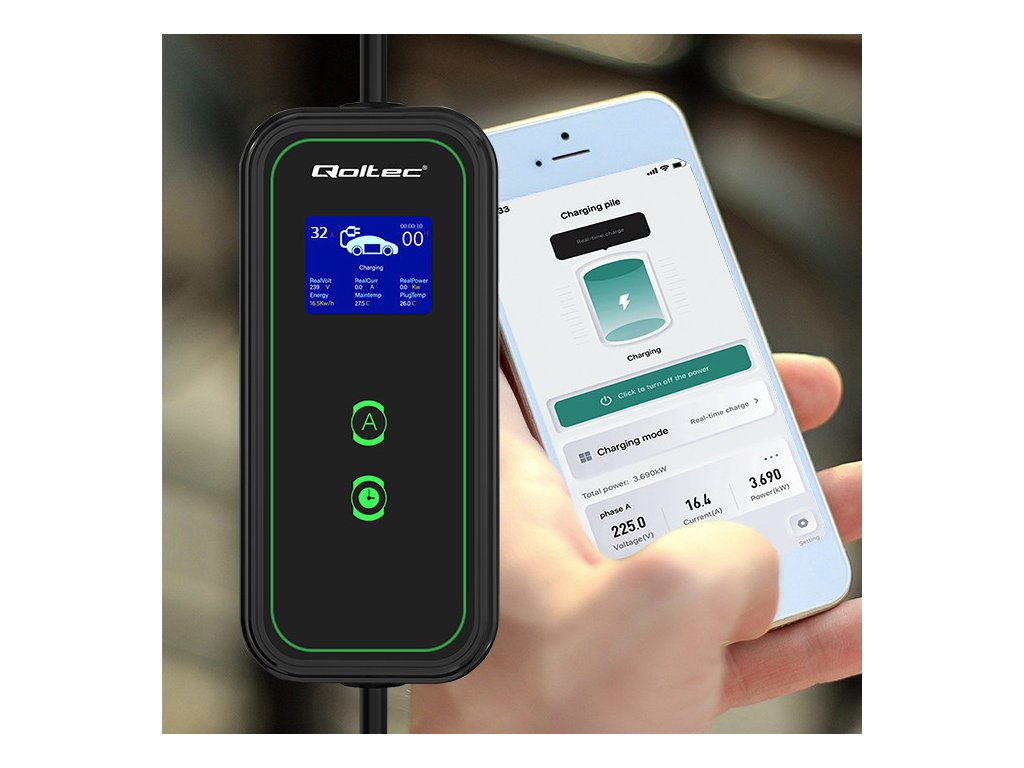 Nabíječka má konektor typu 2 , který je v současnosti oficiálním standardem Evropské unie a nabíjí elektromobily vybavené příslušnou nabíjecí zásuvkou. Konektor typu 2 má 7 pinů, z toho 3 nebo 5 pinů je určeno k nabíjení a 2 ke komunikaci mezi stanicí a autem . Kompatibilní s většinou elektromobilů prodávaných v Evropě. Nabíječka Qoltec podporuje čtyři proudové režimy: 16A, 20A, 24A a 32A . Je vhodné dodat, že konektor typu 2 je určen pro elektromobily s nabíjecím výkonem vyšším než 3kW .