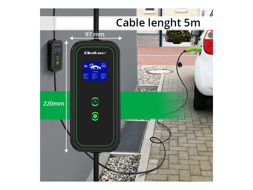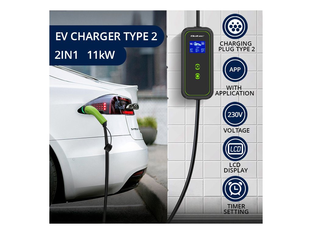 Nabíječka má konektor typu 2 , který je v současnosti oficiální normou Evropské unie a nabíjí elektromobily vybavené příslušnou nabíjecí zásuvkou. Konektor typu 2 má 7 pinů, z toho 3 nebo 5 pinů je určeno k nabíjení a 2 ke komunikaci mezi stanicí a autem . Kompatibilní s většinou elektromobilů prodávaných v Evropě. Nabíječka Qoltec podporuje čtyři proudové režimy: 16A, 20A, 24A a 32A . Je vhodné dodat, že konektor typu 2 je určen pro elektromobily s nabíjecím výkonem vyšším než 3kW .
