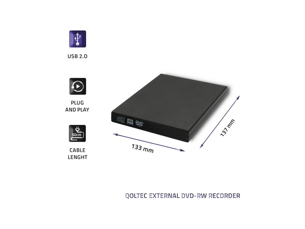 Kryt DVD-RW rekordéru Qoltec je vyroben z tvrdého a odolného materiálu. Je odolný, lehký a dokonale chrání pohon před poškozením. Minimalistický a elegantní design, který poskytuje tenké pouzdro, zajišťuje vynikající estetiku a pohodlí při používání. , které stabilizují pouzdro proti pohybu.