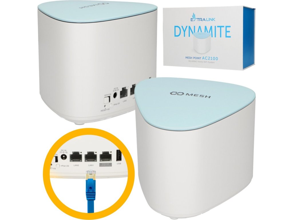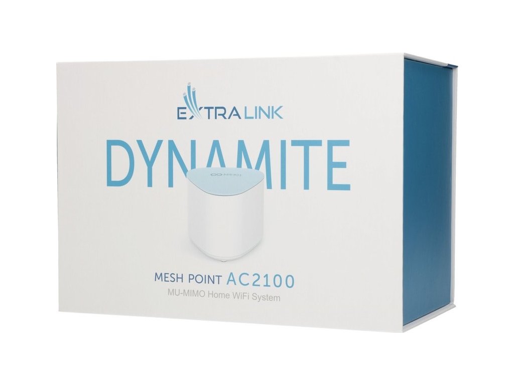 Zařízení Extralink Dynamite Mesh System má výkonný dvoupásmový systém Wi-Fi Mesh, který poskytuje přístup k internetu v každém rohu domu, aniž by byla ohrožena kvalita signálu při pohybu koncového zařízení mezi zařízeními Mesh. Systém Dynamite Mesh je navržen tak, aby se zařízení navzájem propojilo v jedné síti Wi-Fi. Pokud jeden ze satelitů ztratí spojení, ostatní jednotky se automaticky a bez problémů znovu připojí k internetu. Systém zvolí nejlepší cestu pro připojení a zefektivní síť tak rychle, jak je to možné. Dynamite Mesh poskytuje současné připojení na frekvencích 5 GHz s maximální šířkou pásma 1733 Mb/sa 2,4 GHz s maximální rychlostí 300 Mb/sa celková dostupná šířka pásma je až 2100 Mb/s. Integrované výkonné zesilovače signálu zajišťují výjimečně vysoký dosah Wi-Fi a stabilní šířku pásma a 4 antény 3 dBi/5 GHz a 2 antény 3 dBi/2,4 GHz zajišťují ještě lepší bezdrátový výkon.