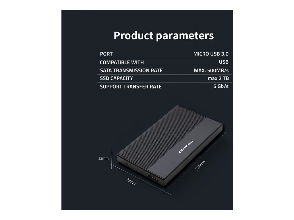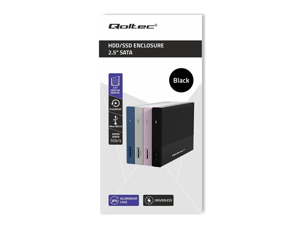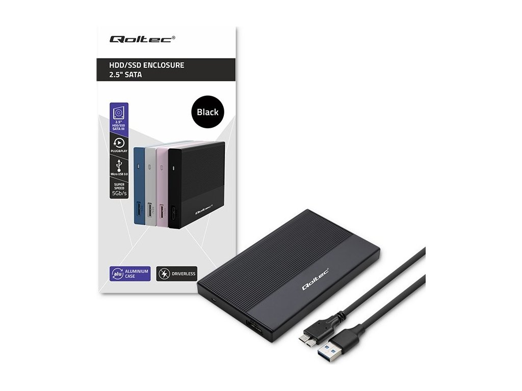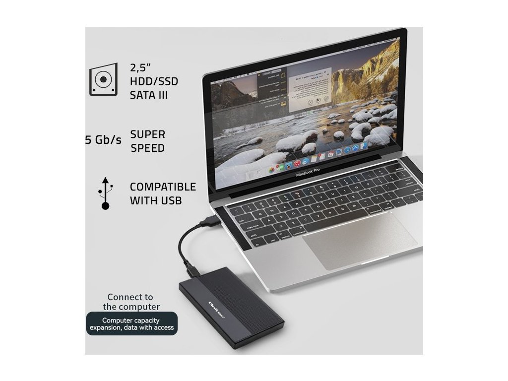 Hliníkové pouzdro | 2,5" SSD HDD šachta | SATA | USB 3.0 | Super rychlost 5 Gb/s | 2 TB | Černý