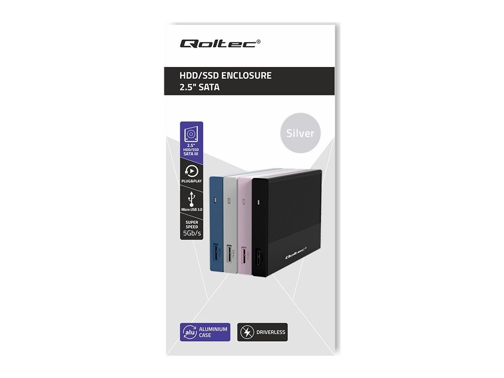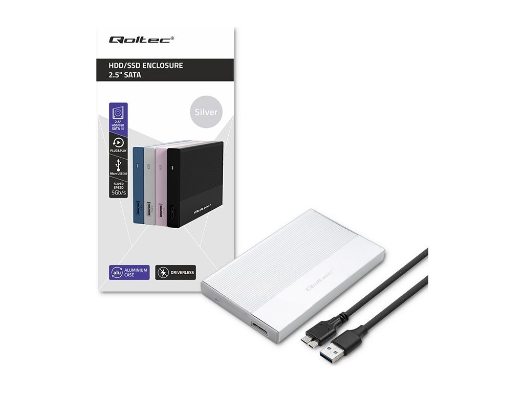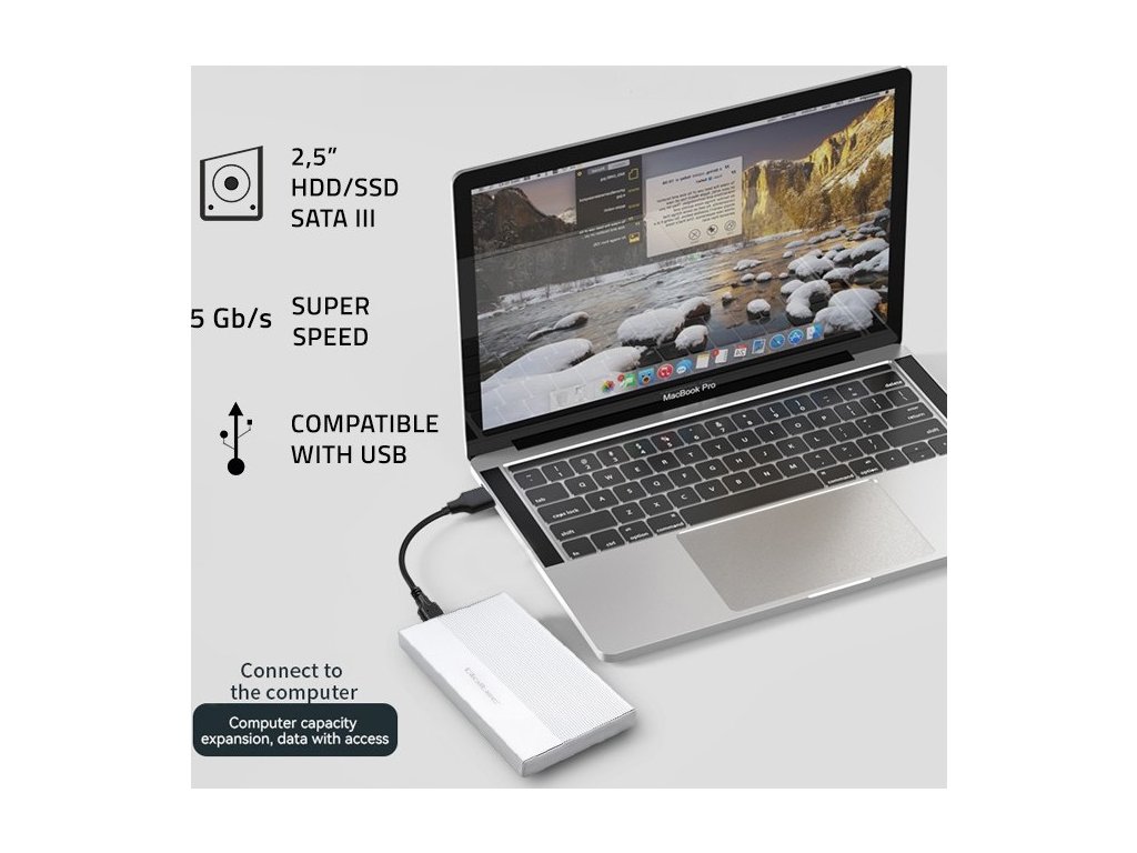 Hliníkové pouzdro | 2,5" SSD HDD šachta | SATA | USB 3.0 | Super rychlost 5 Gb/s | 2 TB | Stříbrná