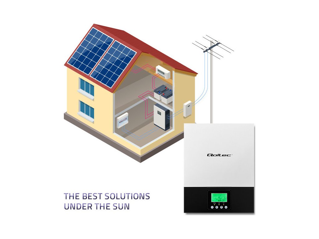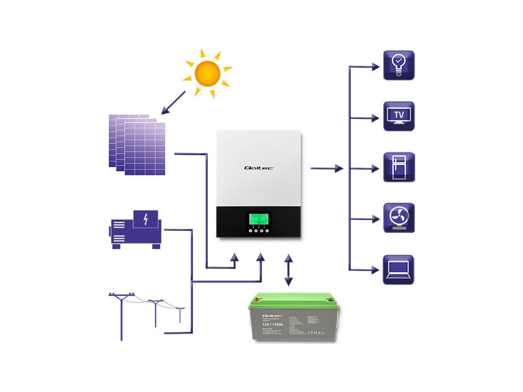 Invertor pracuje v režimu off-grid , využívá přebytečnou sluneční energii k napájení přijímačů a nabíjení baterie. V případě poruchy se elektřina odebírá z FV instalace do zásobníku energie a může bezpečně a nepřetržitě zajistit kontinuitu našich zařízení.