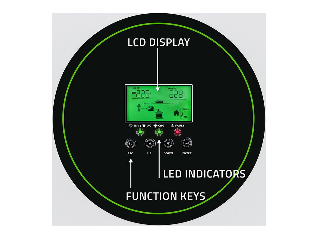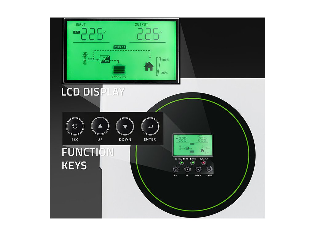 Výrobek je vybaven multifunkčním, snadno ovladatelným dotykovým LCD displejem s ovládacím panelem . Usnadňuje monitorování celé fotovoltaické instalace. Umožňuje konfigurovat rozsah vstupního napětí pro domácí spotřebiče a osobní počítače nebo změnit nastavení priority AC/solární nabíječky. Displej navíc ukládá data a informuje o poruchách , přičemž přiměřeně reaguje, pokud některý z parametrů překročí normu. Pokud dojde k poruše, měnič se vypne .