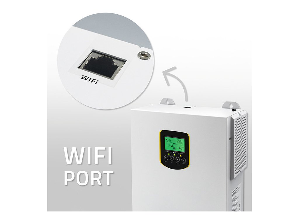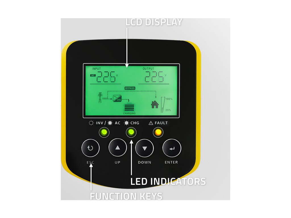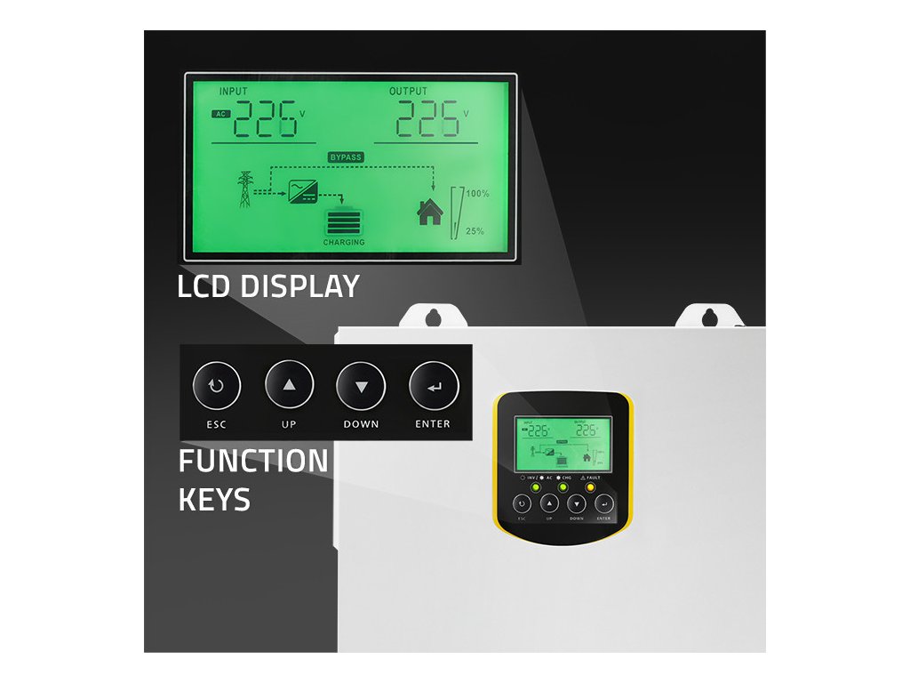 Výrobek je vybaven multifunkčním dotykovým LCD displejem se snadným ovládáním a ovládacím panelem . Usnadňuje monitorování celé fotovoltaické instalace. Umožňuje konfigurovat rozsah vstupního napětí pro domácí zařízení a osobní počítače nebo změnit nastavení priority AC/solární nabíječky. Displej navíc ukládá data a informuje o poruchách , přičemž vhodně reaguje, pokud některý z parametrů překročí normu. Pokud dojde k poruše, měnič se vypne .