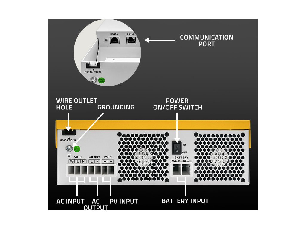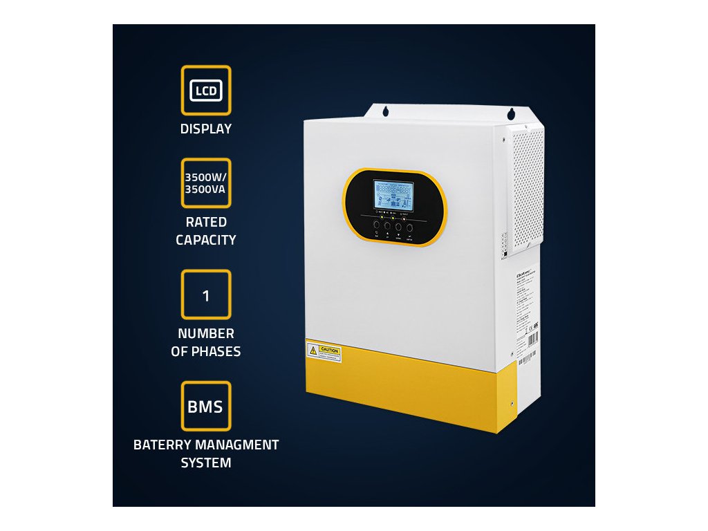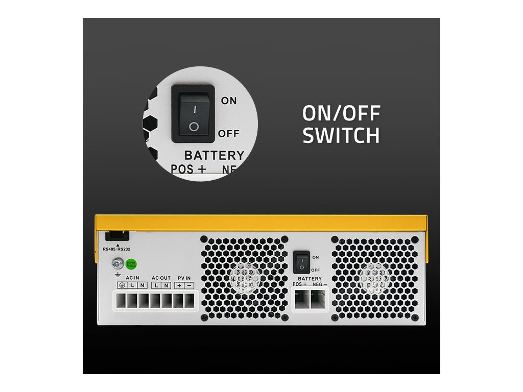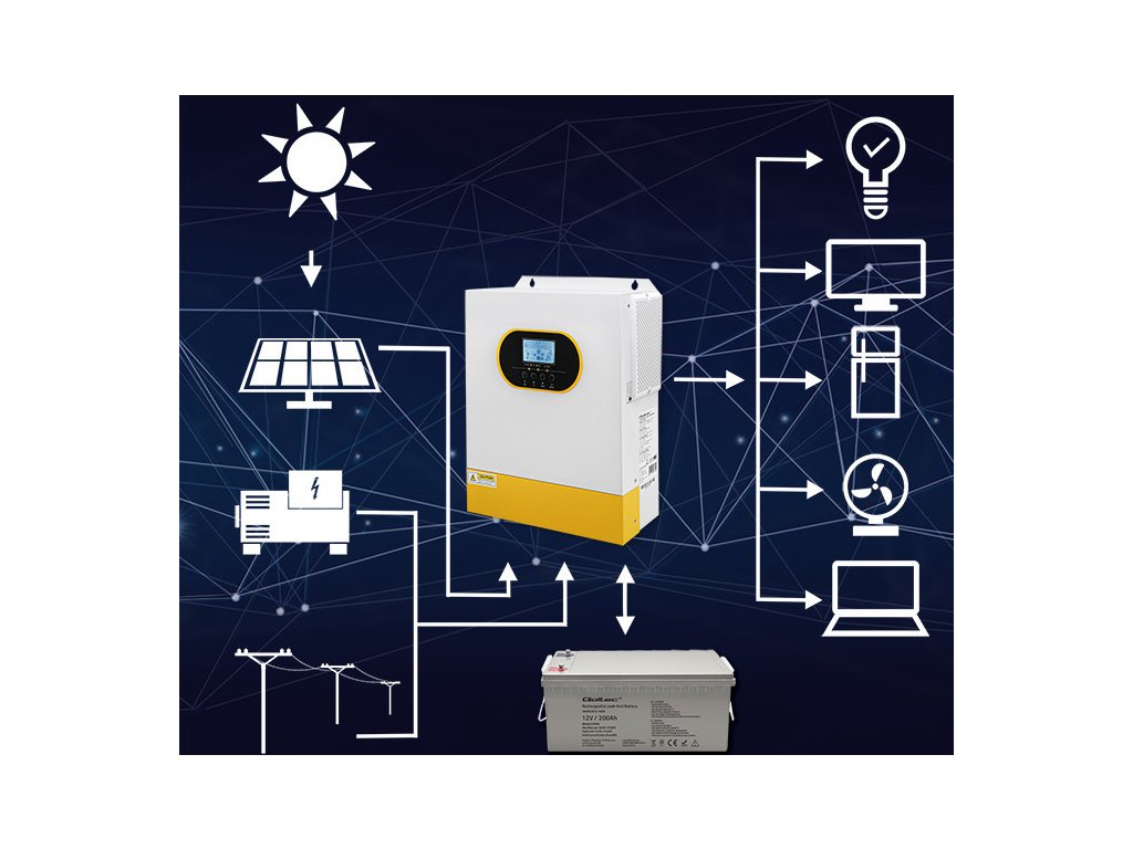 Využívá přebytečnou sluneční energii k napájení přijímačů a nabíjení baterie. Když je produkce energie větší než aktuální potřeba, přebytečný proud lze přenést na nabíjení LiFePO4, AGM, GEL baterií nebo na skladování energie, což umožňuje uskladnění energie pro pozdější použití. Hybridní invertor se může automaticky přepnout do režimu vypnuté sítě a napájet jej z baterií .