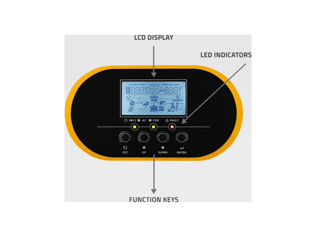 Výrobek je vybaven multifunkčním dotykovým LCD displejem se snadným ovládáním a ovládacím panelem . Usnadňuje monitorování celé fotovoltaické instalace. Umožňuje konfigurovat rozsah vstupního napětí pro domácí zařízení a osobní počítače nebo změnit nastavení priority AC/solární nabíječky. Displej navíc ukládá data a informuje o poruchách , přičemž vhodně reaguje, pokud některý z parametrů překročí normu. Pokud dojde k poruše, měnič se vypne .