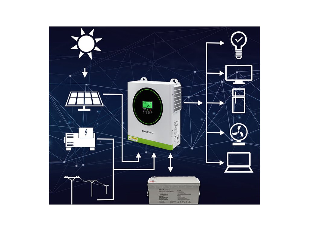 Využívá přebytečnou sluneční energii k napájení přijímačů a nabíjení baterie. Když je produkce energie větší než aktuální potřeba, přebytečný proud lze přenést na nabíjení LiFePO4, AGM, GEL baterií nebo na skladování energie, což umožňuje uskladnění energie pro pozdější použití, např . . Hybridní měnič se může automaticky přepnout do režimu vypnuté sítě a napájet jej z baterií .