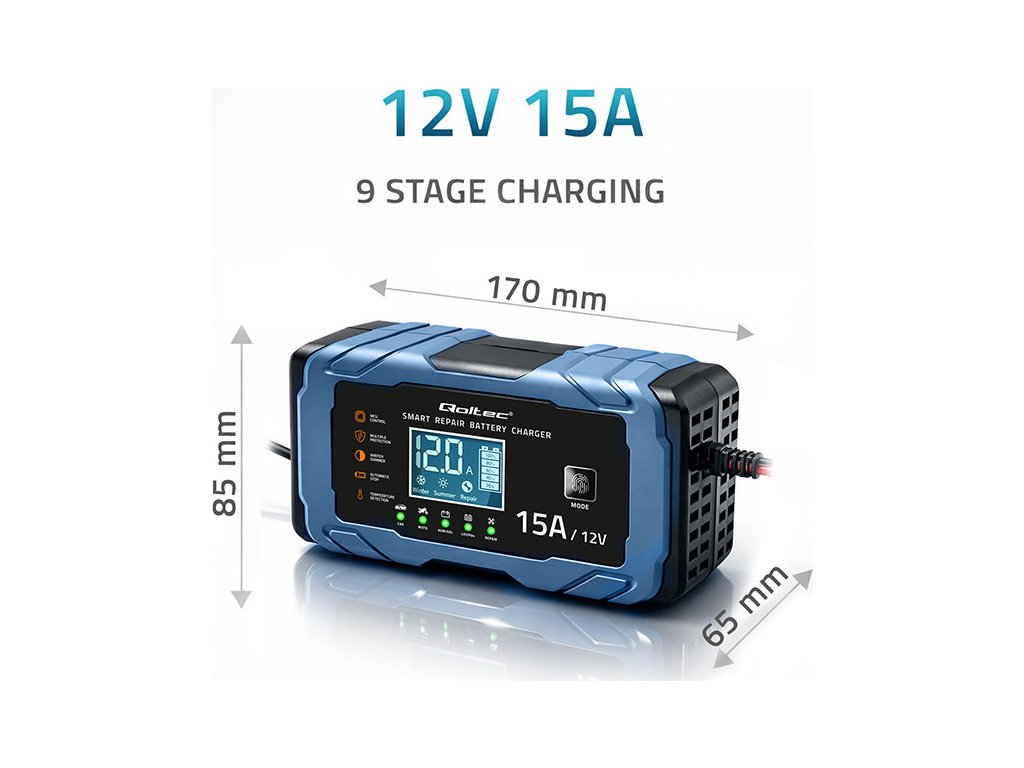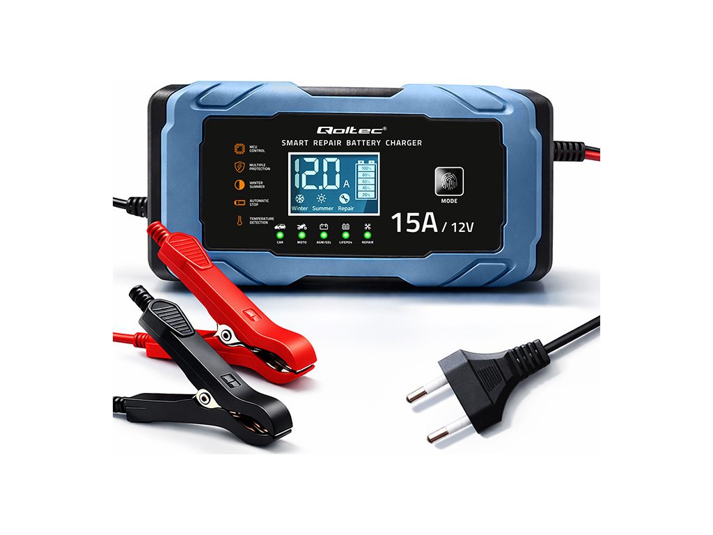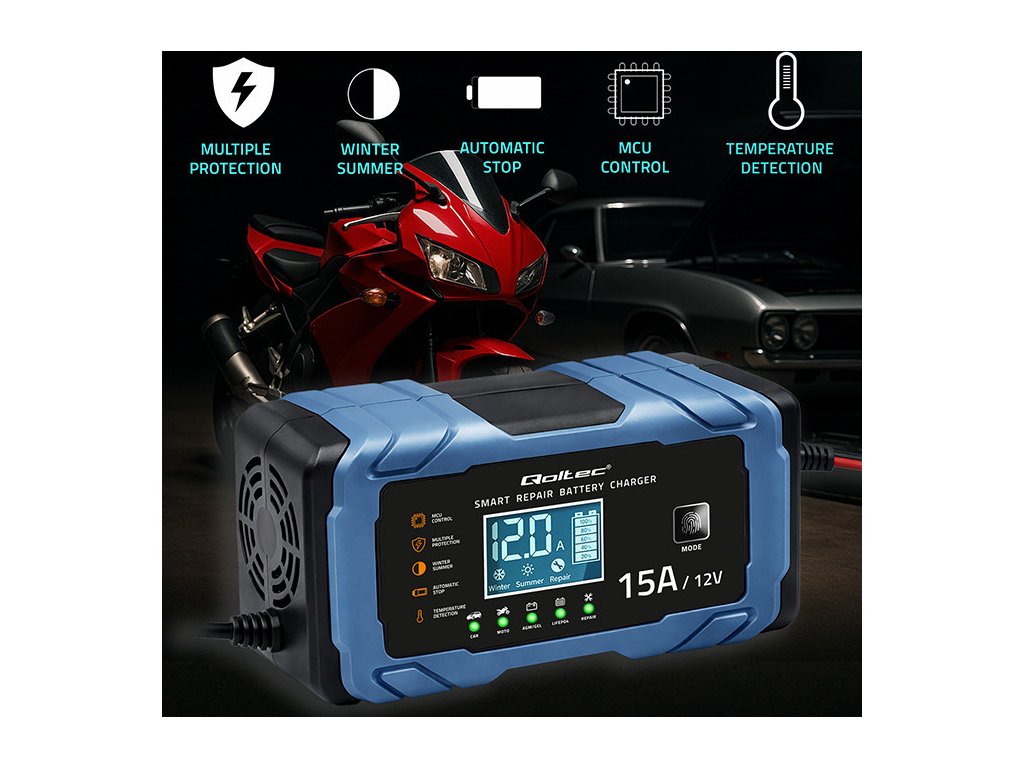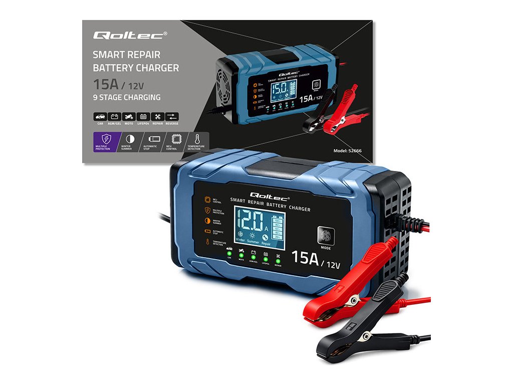 Nabíječka Qoltec nabízí přesné nabíjení založené na mikroprocesoru ; jedna nabíječka je dostatečná pro různé typy baterií. Čas potřebný k nabíjení závisí na stupni vybití baterie a její skutečné kapacity . Nabíječka je určena k nabíjení baterií v automobilech, motocyklech, lodích, sekačkách na trávu, zemědělských vozidlech a čtyřkolkách.