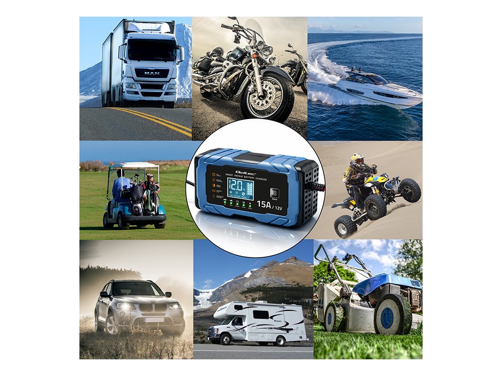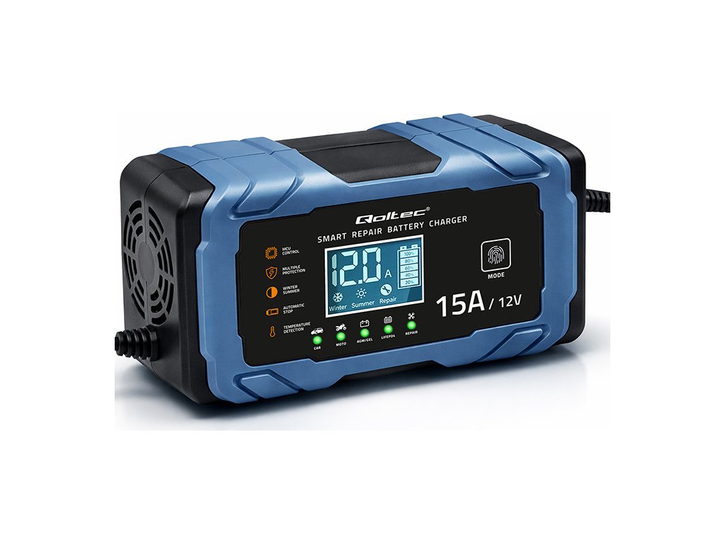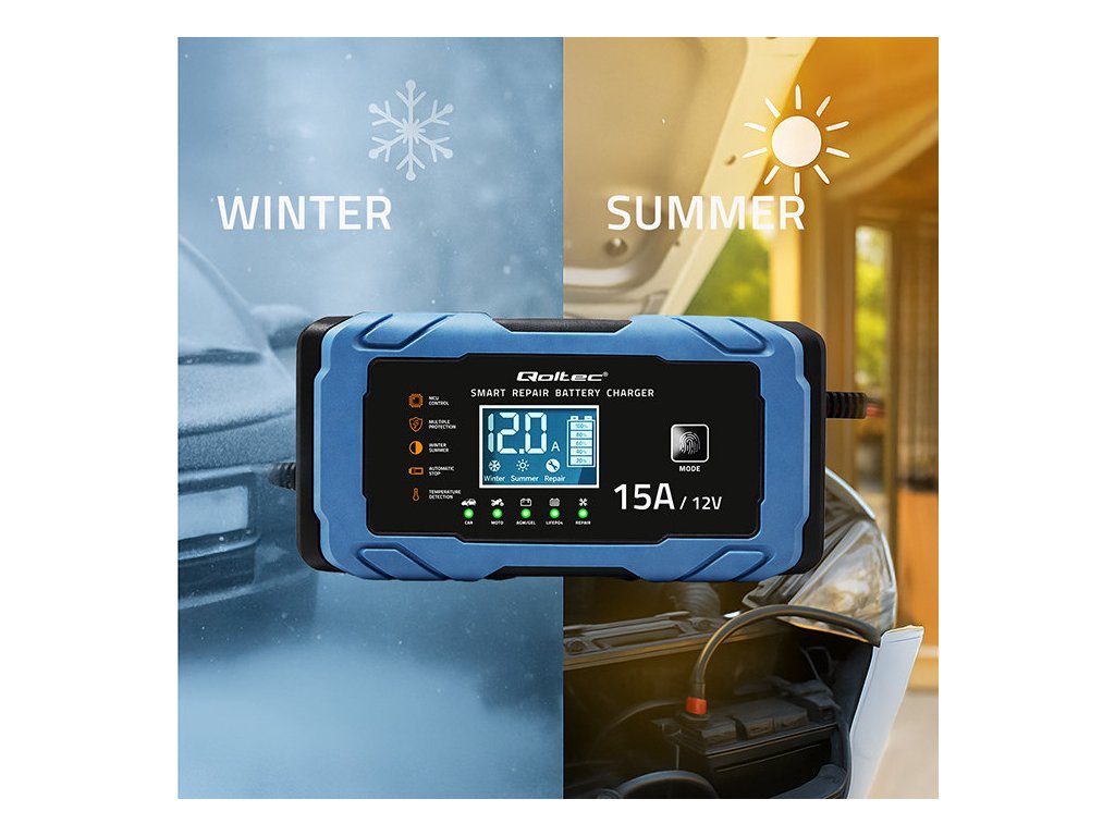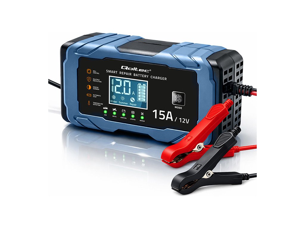 Nabíječka Qoltec nabízí přesné nabíjení založené na mikroprocesoru ; jedna nabíječka je dostatečná pro různé typy baterií. Čas potřebný k nabíjení závisí na stupni vybití baterie a její skutečné kapacity . Nabíječka je určena k nabíjení baterií v automobilech, motocyklech, lodích, sekačkách na trávu, zemědělských vozidlech a čtyřkolkách.