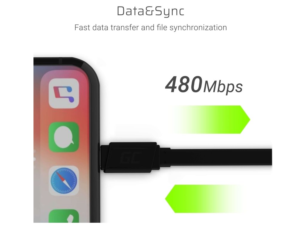 Kabel Green Cell také zajišťuje rychlý přenos dat rychlostí 480 Mbps - za 100 sekund lze přenést i 100 hudebních děl. Neztrácejte čas čekáním!