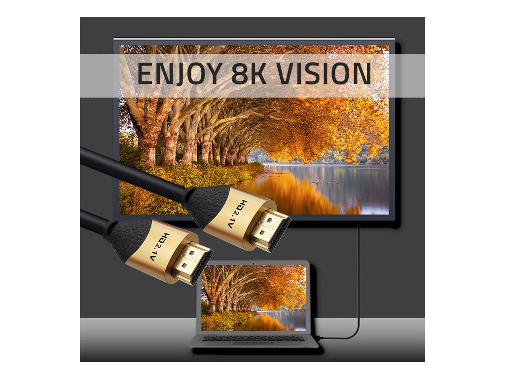 Kabel HDMI 2.1 nabízí kvalitu obrazu v rozlišení 7680 x 4320 při frekvenci 120 Hz a funkce VRR minimalizuje jakékoli zkreslení obrazu a pevný PVC materiál a pozlacené koncovky zajišťují jeho odolnost a absenci rušení signálu.
