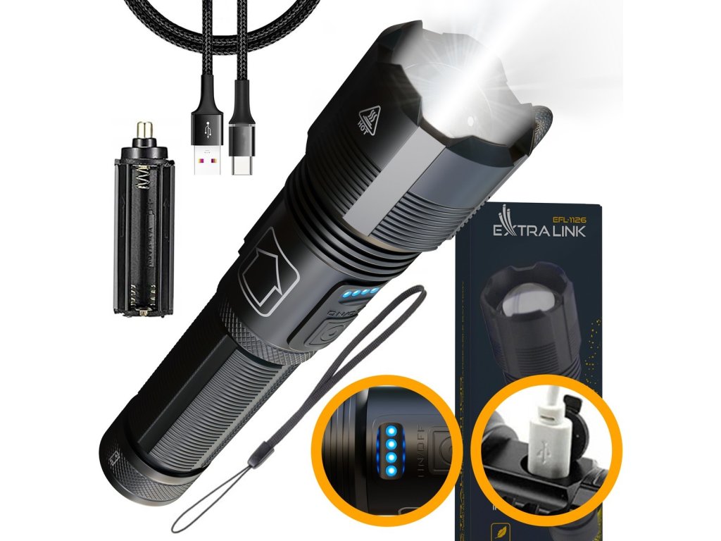 Baterka používá baterii 18650 (není součástí balení), kterou lze v případě vybití mnohokrát dobít. Může být také napájena třemi AAA bateriemi . Taktická baterka Extralink má 4 modré diody indikující úroveň nabití: 100%-75%-50%-25%.