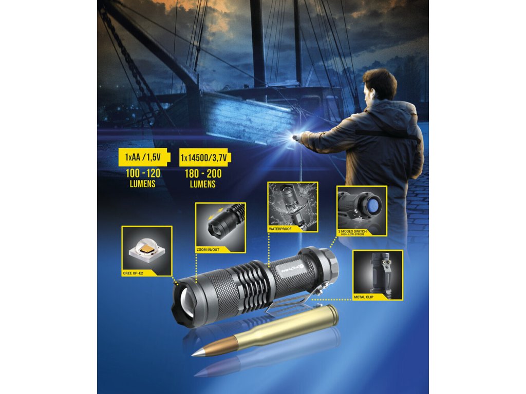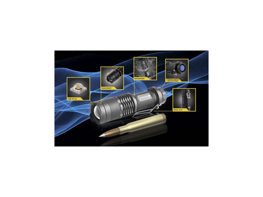 Ruční baterka everActive FL-180 využívá velmi efektivní, originální diodu Cree XP-E2 o jmenovitém výkonu 3W, která umožňuje získat více světla při zachování dlouhé doby hoření.