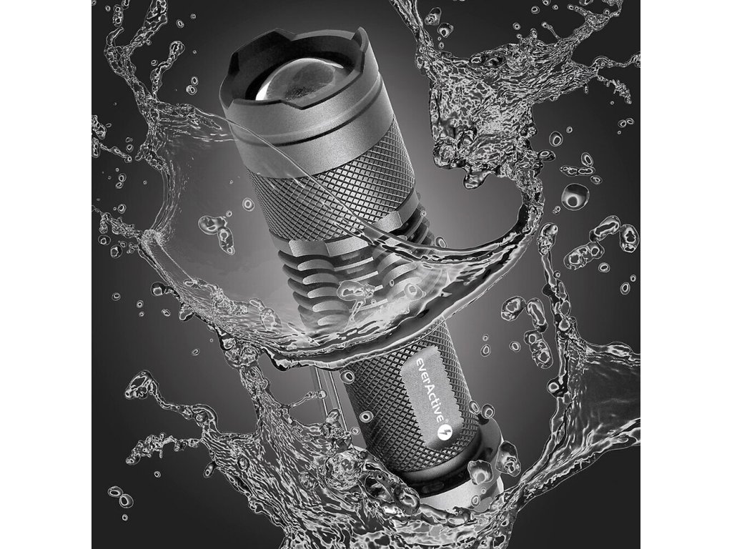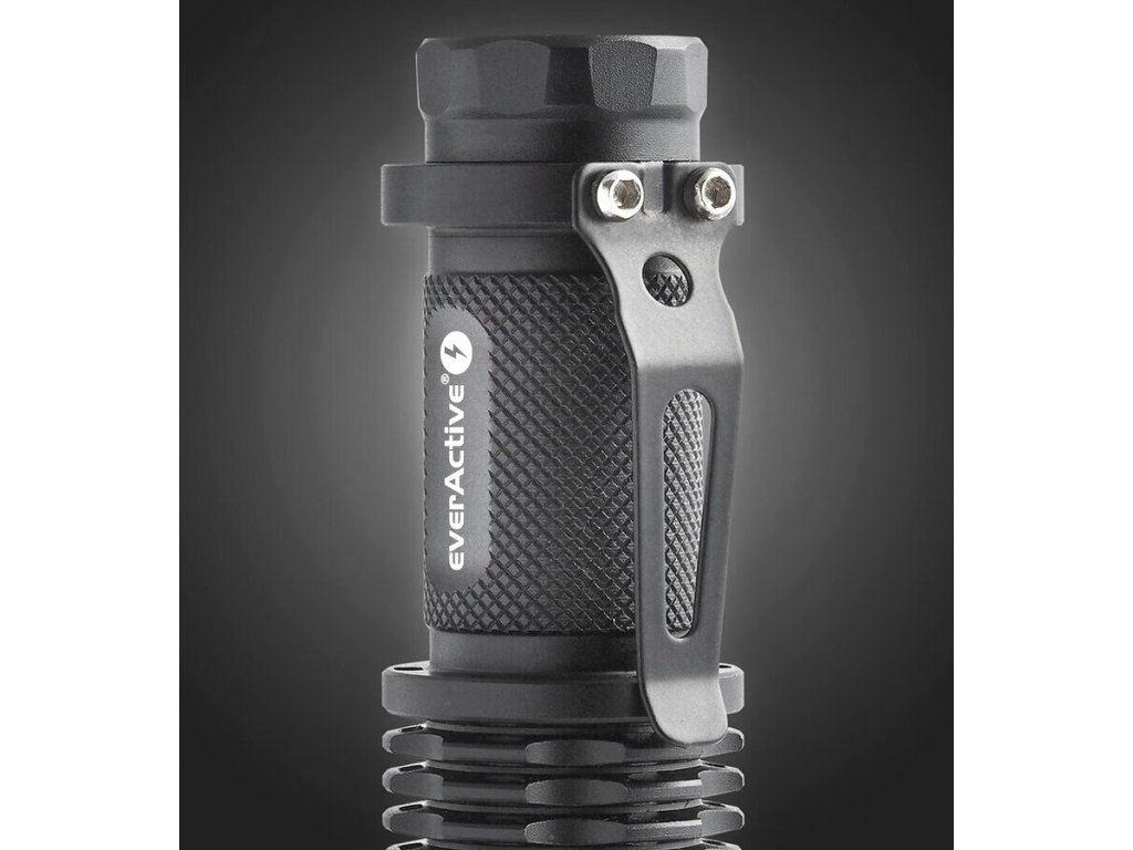 Pouzdro baterky everActive FL-180 je vyrobeno z odolného hliníku, lakovaného titanu a je odolné vůči povětrnostním vlivům díky gumovým O-kroužkům. Hluboce uložený vypínač umístěný na zadní straně baterky umožňuje její použití jako svíčka (na rovném povrchu) v případě výpadku proudu. Baterka je vybavena přídavným, odnímatelným klipem/zásuvkou pro pohodlné připevnění baterky.