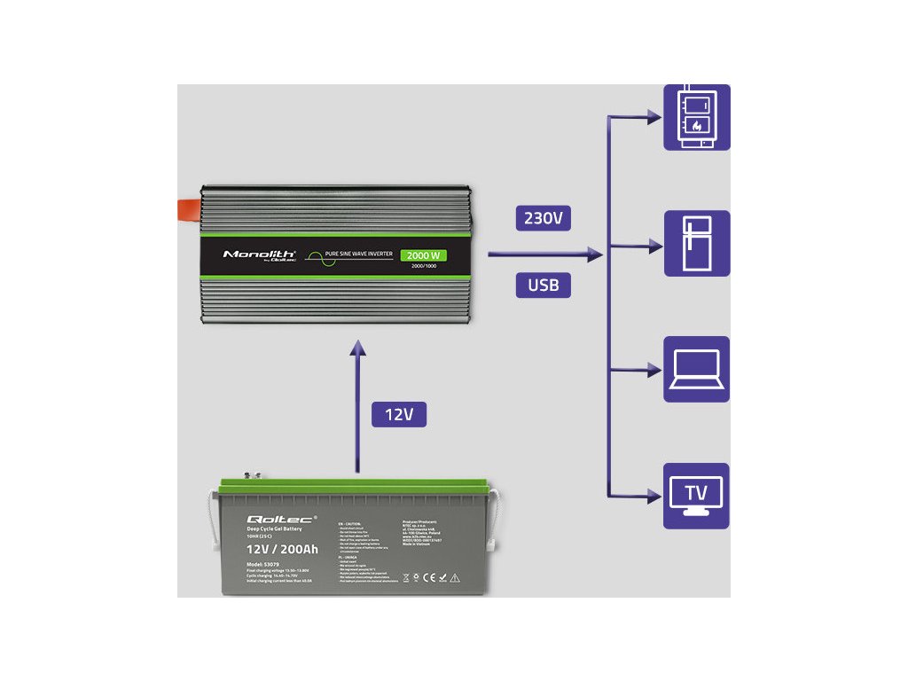 Invertor Qoltec je čistý sinus , produkuje stejný proud jako v zásuvce 230V , čímž zajišťuje bezpečnost všech připojených zařízení. Skvělá bude jak při výpadku proudu , tak i při cestování , když nemáme přístup k zásuvce.