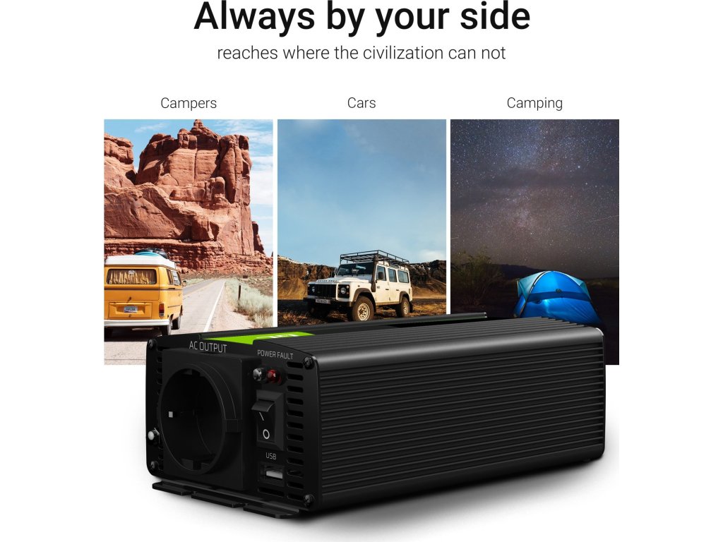 Měnič je skvělou volbou pro každého, kdo cestuje autem, karavanem nebo kamionem. Bude perfektní na místech bez přímého přístupu k zásuvkám.