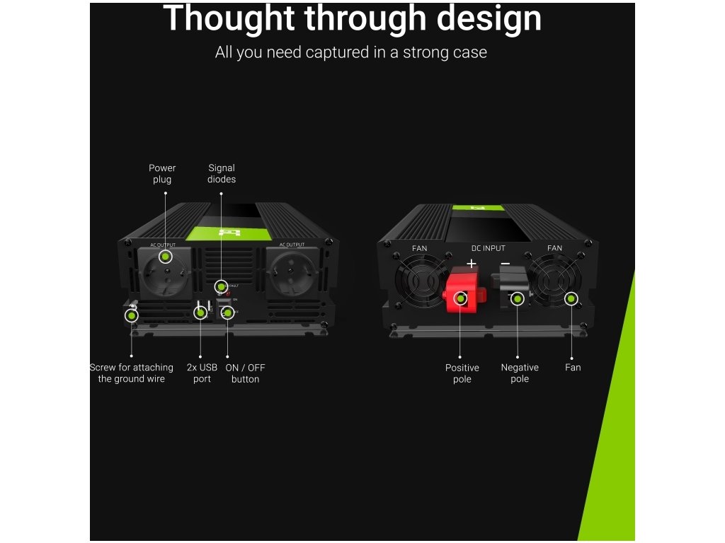 Zařízení bylo navrženo pro nejvyšší pohodlí při používání. Přední strana měniče je vybavena síťovou zásuvkou přizpůsobenou konektorům používaným v celé Evropě a USB portem , díky kterému můžeme nabíjet náš smartphone, čtečku elektronických knih a jakékoli jiné zařízení s možností připojení přes USB port.